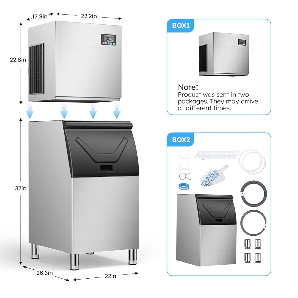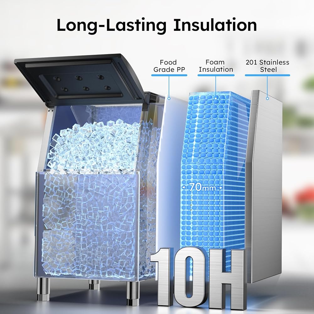 560 رطلاً من مساحة تخزين الجليد: يمكن لدلو تخزين الجليد تخزين ما يصل إلى 560 رطلاً من مكعبات الثلج ويمكنه الاحتفاظ بمكعبات الثلج لمدة 10 ساعات دون ذوبان. يتبنى دلو تخزين الجليد تصميمًا من 3 طبقات ، وقلب 201 من الفولاذ المقاوم للصدأ ، ورغوة عزل عالية الكفاءة والبلاستيك من فئة الطعام. يوجد استنزاف في الأسفل ، مما يجعل من السهل تنظيف دلو الجليد. تحتوي آلة الجليد على وظيفة صنع الجليد في الوقت المناسب ، وتتيح لك مساحة التخزين الكبيرة الحصول على المزيد من الجليد في الوقت المناسب.