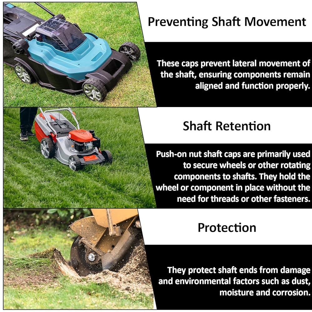 • Versatile Application: Ideal for 3/8-inch shafts, these axle pushnut fasteners are suitable for a wide range of wheeled equipment, such as carts, wheeled trash bins, pressure washers, and lawn mowers. They effectively cover the exposed ends of shafts, rods, and studs