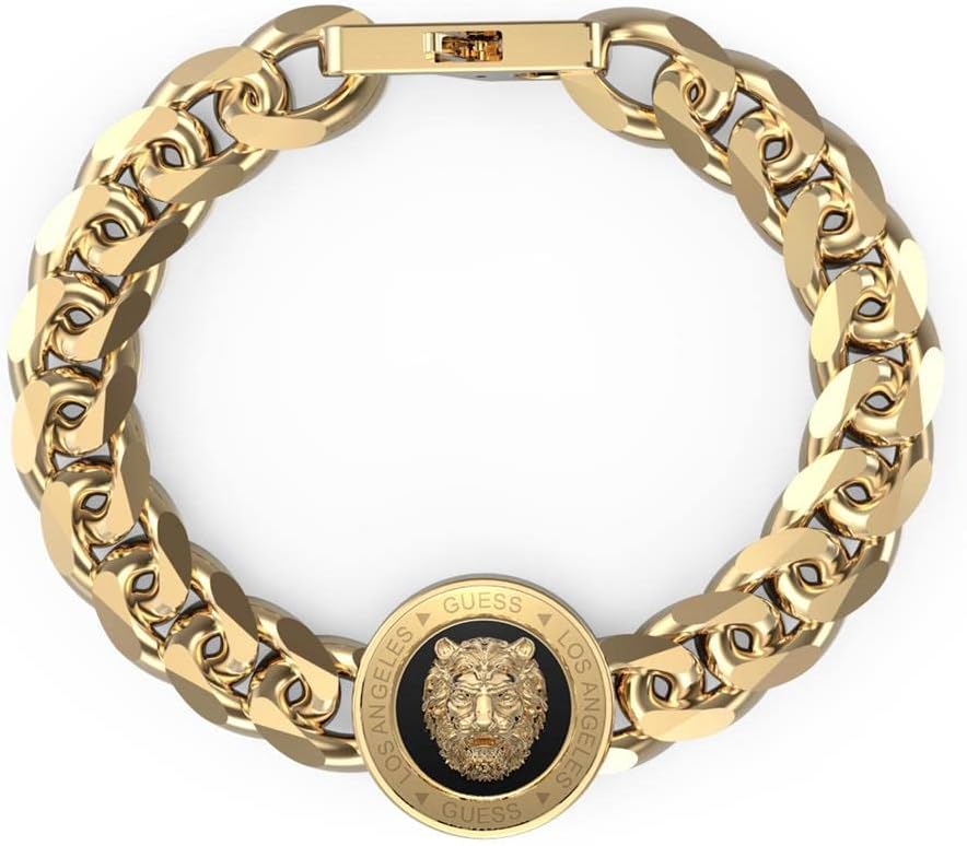 Esta pulsera Guess JUMB01314JWYGBKS Lion King orientada para hombre. De acero dorado con eslabones y la representativa cabeza de león. La colección Lion King de Guess reinventa el icono del león y lo usa como símbolo de fuerza y de coraje. Disfruta de tu pulsera Guess.