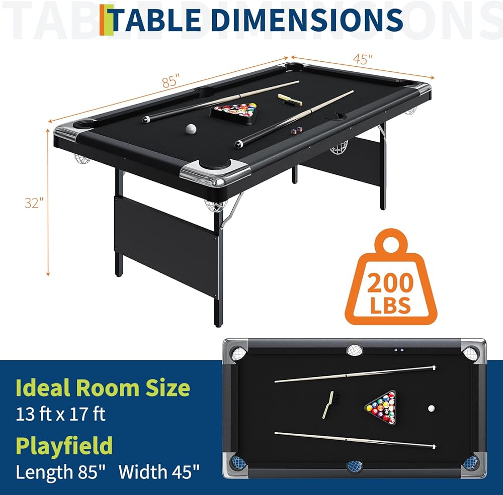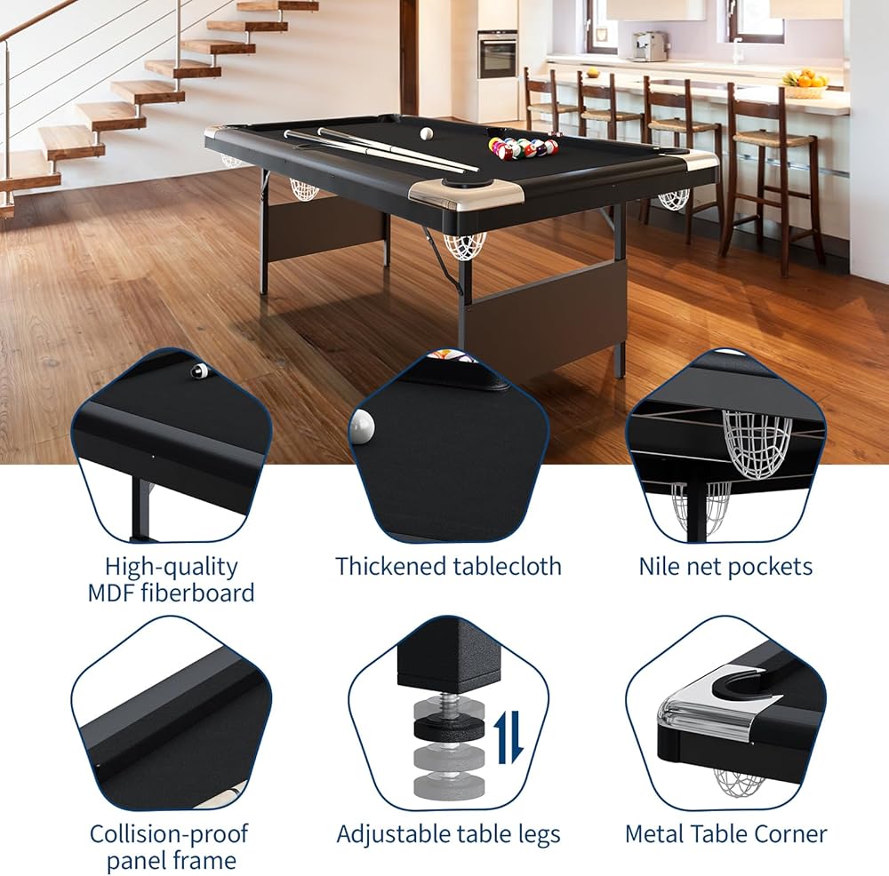 SUPERIOR DURABILITY: This pool table is made with high-quality MDF, which is firm and stable for a long time, and has a premium felt surface for smooth gameplay. The table is equipped with a heavy-duty leg brace to ensure sturdiness during use. Adjustable non-slip feet to adjust balance and prevent scratching the floor.