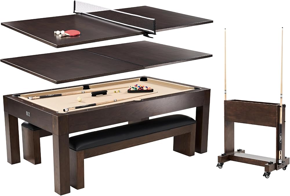الجدول القياسي الحجم 3 في 1: يحتوي هذا الجدول البليارد الذي يبلغ طوله 7 بوصات على قمة طعام يمكن استخدامها في تنس الطاولة أو تخزينها على Caddy المتداول المرفق لإجراءات تجمع تنافسية مع حجم حقل اللعب الموجود في العديد من قضبان البلياردو ، ويشحن جزئيًا.