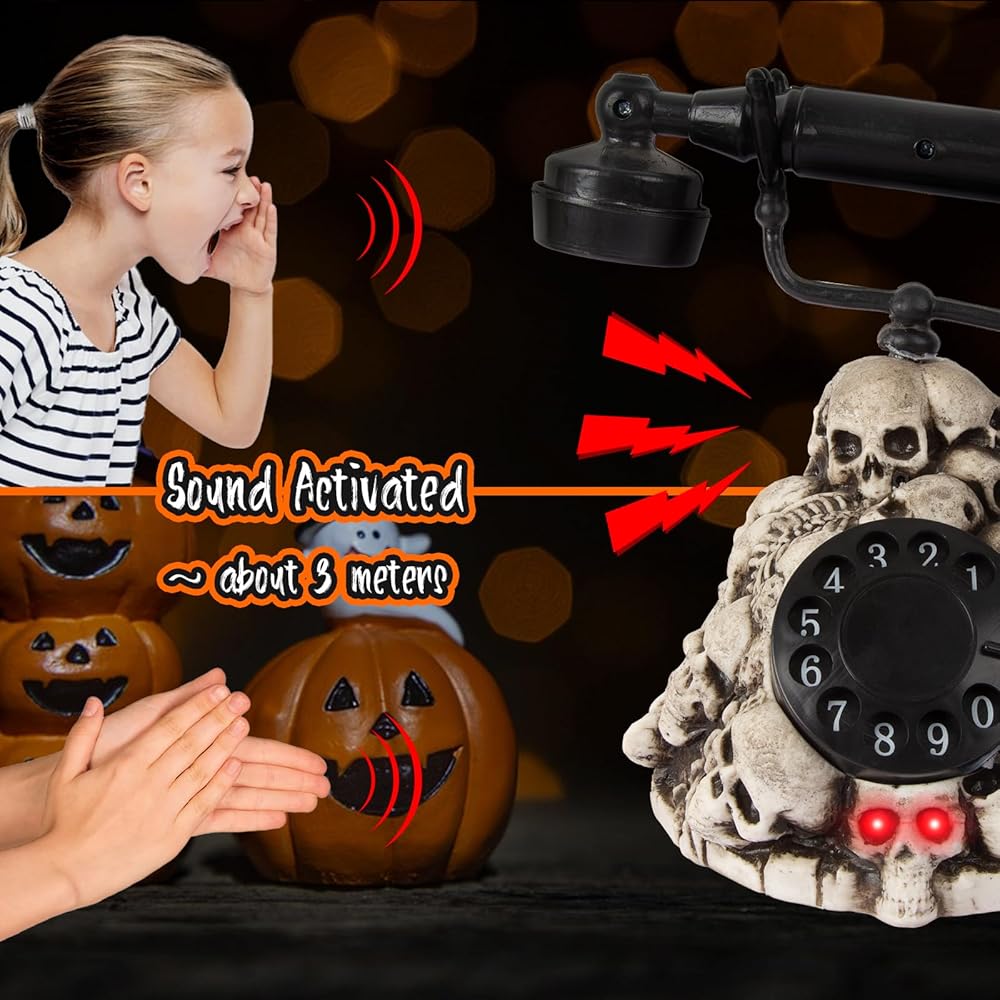Touch and Sound Sensor Activated: When the sound sensor is activated or the dial is turned, the phone will ring and emit five bone-chilling phrases. For example, "Look behind you"... I bet you dare not~