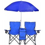 Upgrade your outdoor adventures with this Portable Double Folding Chair Set. Designed for comfort and convenience, it features two connected chairs, a built-in insulated cooler, mesh cup holders, and a removable umbrella to keep you shaded. Whether you're tailgating, camping, or enjoying a day at the beach, this all-in-one seating solution ensures you'll always have a cool drink in hand and relief from the sun. The durable frame folds down easily and fits into the included carry bag for grab-and-go portability. Perfect for taking to the stadium for tailgating, the beach, camping, kids' soccer games, or anywhere else where you want to relax. Each Double Folding Chair folds down to a compact size and fits into an included matching carrying case for easy transporting. Weighing in at around 13 pounds, the Double Folding Chair features a center armrest that doubles as a cooler for storing your ice-cold beverages. Also includes a detachable umbrella to keep you shaded on those hot summer days. Measures 60 in x 33.5 in x 21 in. Umbrella measures 54 inches in diameter. Built on a tubular steel frame and made of 600D coated nylon.