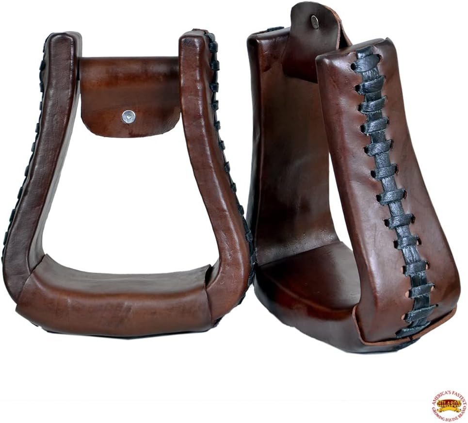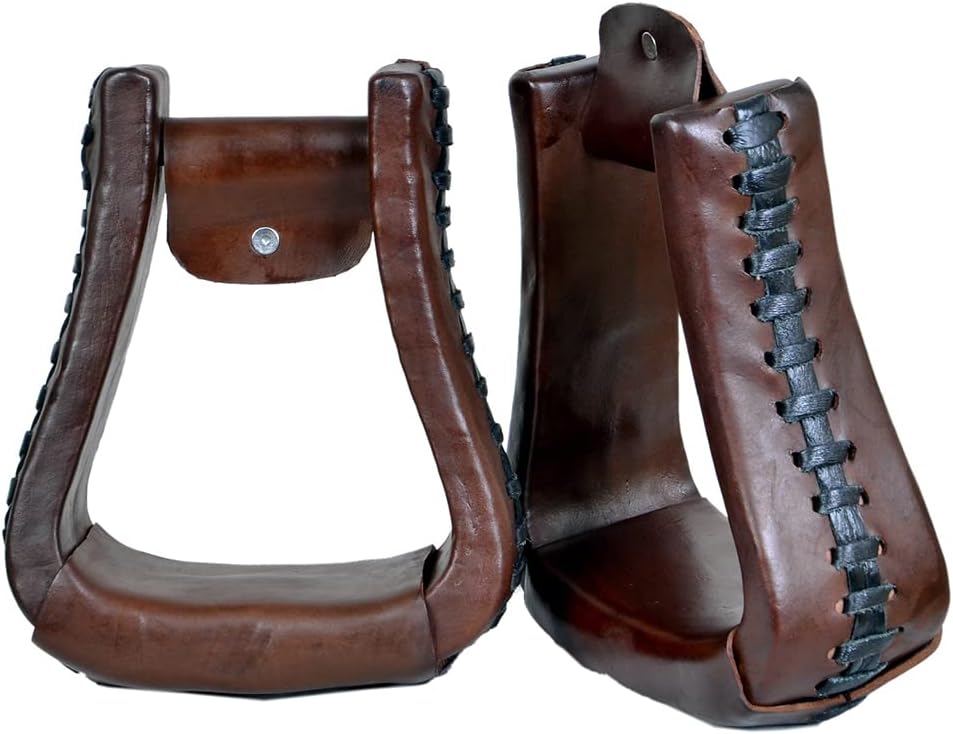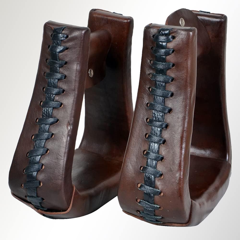 ✔ PREMIUM QUALITY MATERIALS-: This is a Hilason Saddle Stirrup made with a high-quality thick genuine skirting leather cover with a super strong wooden core. Our Leather stirrups are designed to withstand the rigors of daily use while maintaining their integrity and aesthetics over time. These horse saddle stirrups are ideal for all Western-purpose riding. The Neck size is 3 inches. approx, the width is 5 inches. approx the height is 5.5 inches. approx and the color is Dark brown color.
