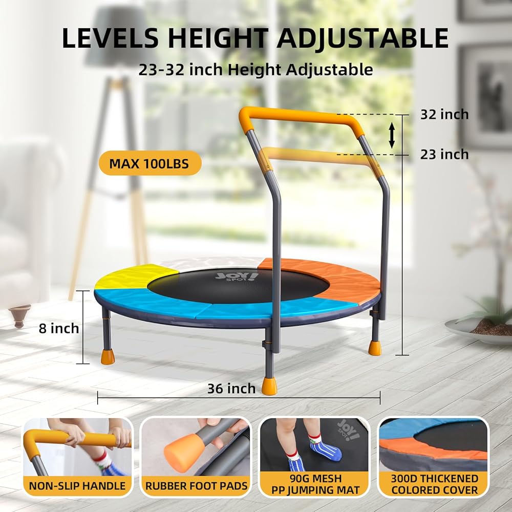 مقبض قابل للتعديل للأطفال الصغار المتناميين: يتميز Toddler Trampoline بمقود قابل للتعديل (23 "-32") مصمم للعب النشط الآمن. مثالي للأعمار من 1 إلى 6 ، وهو يدعم ما يصل إلى 100 رطل مع تقديم الاستقرار والراحة مع مثالي قبضة غير قابلة للانزلاق لكل تجربة ترامبولين للأطفال