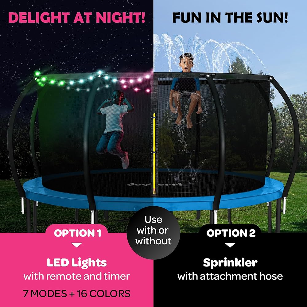 DAZZLING LED LIGHTS & OPTIONAL SPRINKLER - elevate your nighttime jumping experience with included the LED lights featuring 16 vibrant colors, 7 modes and remote control. And if you're looking for a cool escape, consider installing the included optional sprinkler system to beat the heat.
