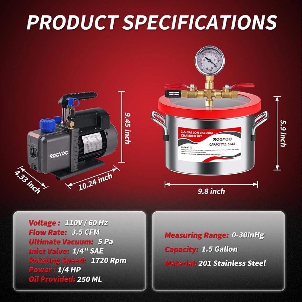توفر مجموعة Rogvoc 5 Gallon Vacuum Chamber أداءً موثوقاً بهدوءًا للبلات الراتنج ، وصبر السيليكون ، وأكثر من ذلك. يتميز بمضخة 3.5 CFM مع فراغ نهائي 5PA ، فإنه يزيل فقاعات الهواء بكفاءة للحصول على نتائج ناعمة ومهنية. مثالي للمختبرات والحرف والاستخدام الصناعي الخفيف