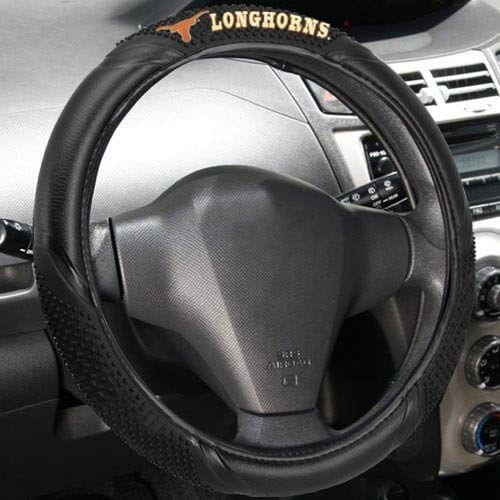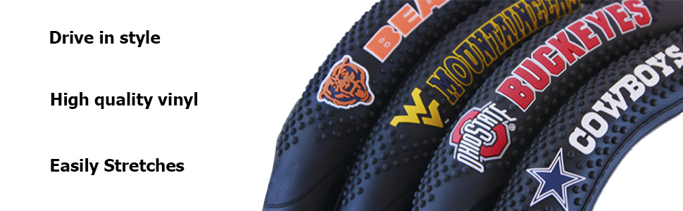 This is a high quality vinyl steering wheel cover with massage surface for a comfortable grip. it features team colors and logo and slips easily with no lacing. the massage steering wheel cover fits most standard steering wheels.