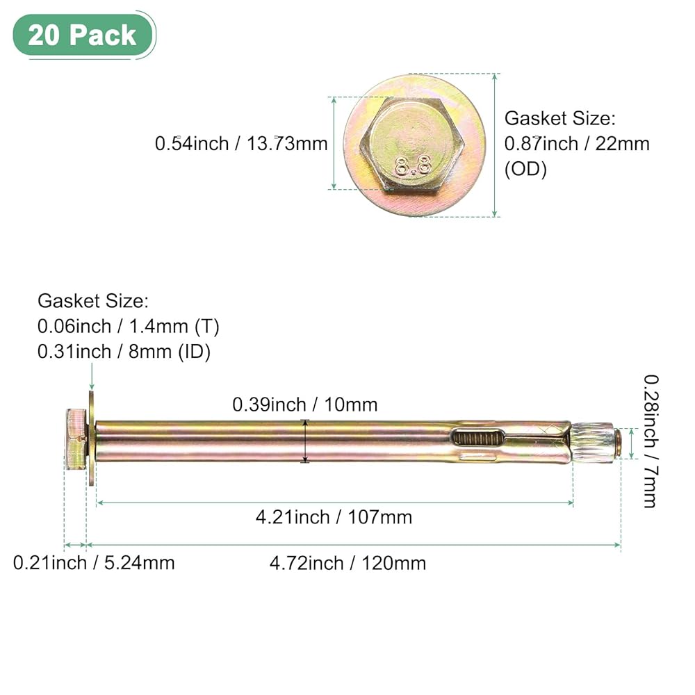 [Size & Package] - تأتي الحزمة مع 20 عبوة من مسامير التوسع M6x40mm مرساة في حجم M6x40mm. طول المسمار: 40 مم / 1.57 بوصة ؛ حجم الغلاف: 35 × 8 مم / 1.38 × 0.31 في (L x OD) ؛ الجانب الآخر المعاكس: 9.79 مم / 0.39 بوصة ؛ حجم الحشية: 6 × 15 × 1 مم / 0.24 × 0.59 × 0.04 في (ID x od x t) ؛ سمك الرأس: 4.3 مم / 0.17 بوصة ؛ قطر المسمار: 6 مم / 0.24 في