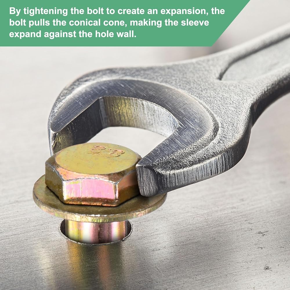 [التثبيت] - عن طريق تشديد الترباس لإنشاء تمدد ، يسحب الترباس المخروط المخروطي ، مما يجعل الأكمام يتوسع مقابل جدار الثقب ، مما يحقق تأثيرًا ثابتًا