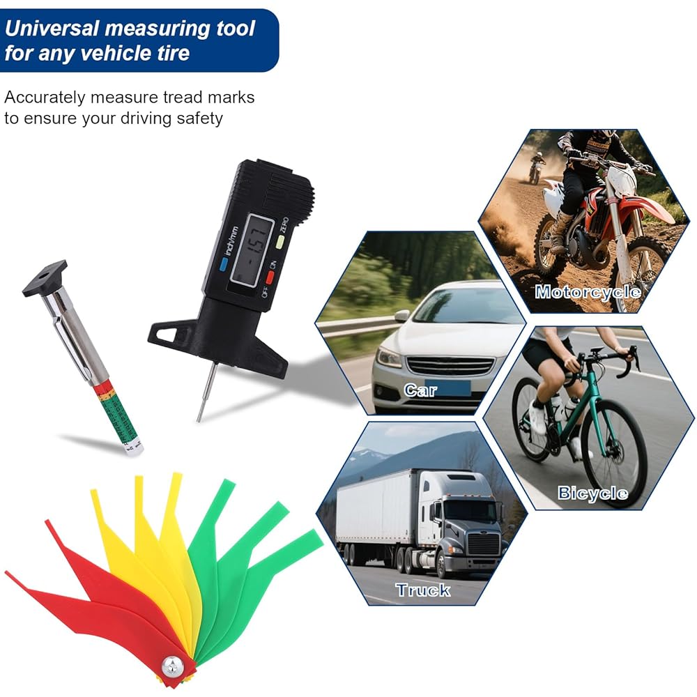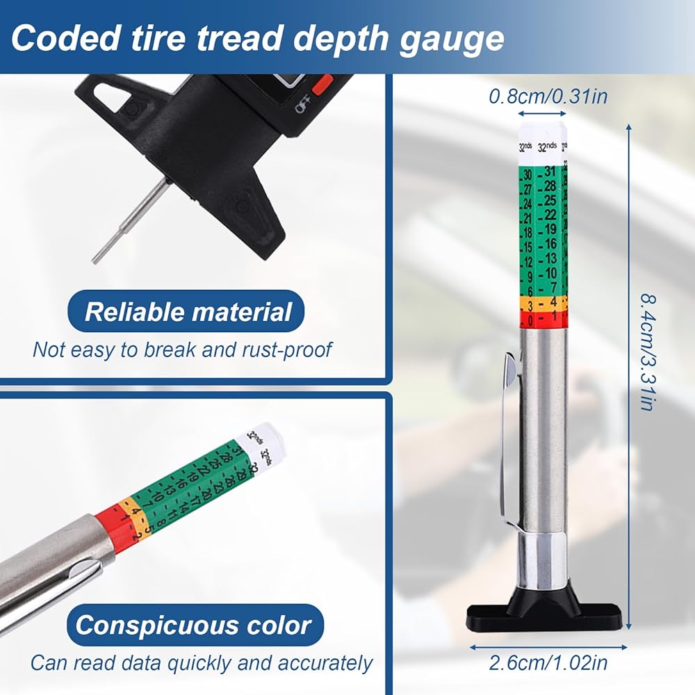 Product List: You will receive 3 pieces of tire tread depth gauge tools, including a color-coded ruler, an electronic depth gauge, and a depth gauge to accurately measure the tread depth and brake pad thickness of your vehicle.
