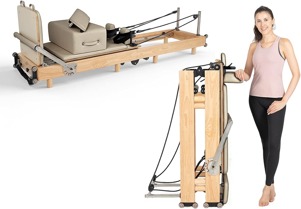 Sturdy Reformer Pilates Machine: it has a solid and sturdy frame that can support up to 400 lbs of user weight. The frame is made of high-quality oak wood via sturdy traditional joint stucture .