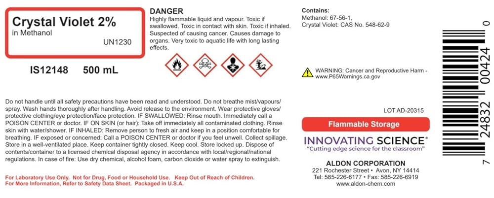 Innovating Science's 2% menthol solution crystal violet comes in a 500mL bottle. Often used as a staining agent, this makes the chemical a perfect fit in any educational lab dealing with microbiology or histology. Each bottle has safe handling and storage procedures printed directly on the bottle. This is a high quality chemical product manufactured in the United States.