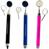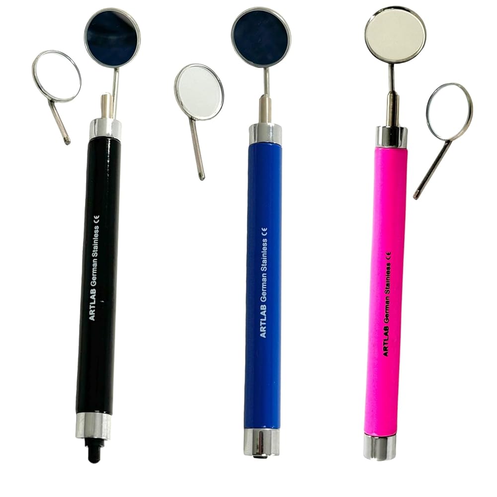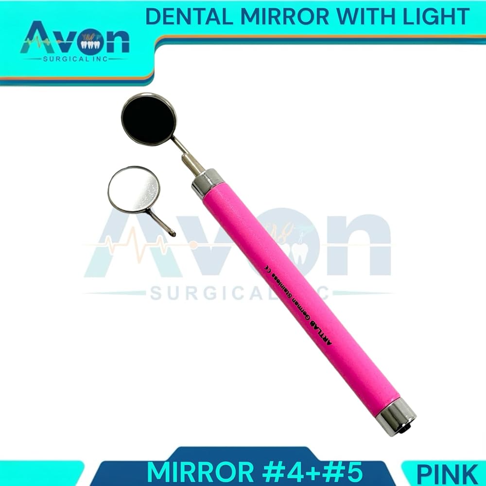 Available in quantities of 1, 2, 3, and 5 with varying colored handles. Each handle includes (1) mirror #4 + (1) mirror #5. High-quality German stainless steel construction: The mirror handle is made of durable German stainless steel, ensuring that it will last for years to come. Ergonomically designed handle for comfortable grip: The handle is designed to fit comfortably in your hand, allowing you to use the mirror handle for long periods of time without experiencing fatigue. The handle is also non-slip, so you can be sure that it will stay in your hand even when your hands are wet. Two interchangeable mirrors: #4 and #5: The mirror handle comes with two interchangeable mirrors, #4 and #5. Mirror #4 is a large, flat mirror that provides a wide field of view, ideal for general examinations and procedures. Mirror #5 is a smaller, angled mirror that allows for easy access to hard-to-reach areas of the mouth, such as the back teeth and under the gum line. Built-in LED light for clear visibility: The mirror handle features a built-in LED light that illuminates the oral cavity, providing clear visibility in even the darkest corners of the mouth. The LED light is powered by two AA batteries (not included), ensuring reliable and long-lasting illumination. Powered by two AAA batteries (not included): The batteries are easy to replace, so you can be sure that you will always have a working mirror handle.