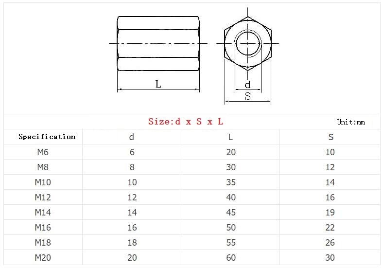 For example: M6*10*20 (internal thread diameter 6mm* opposite side 10mm* length 20mm)