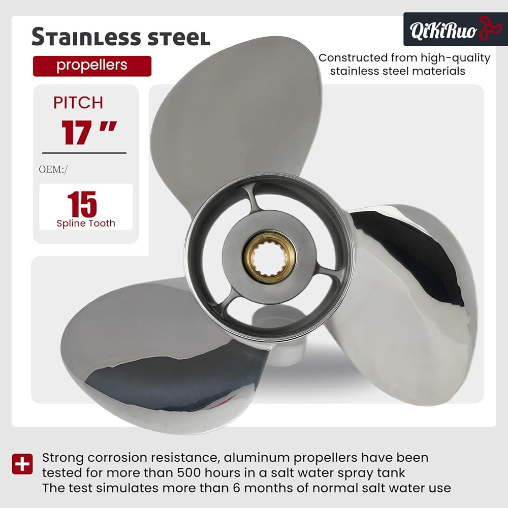 Easy Installation:14 1/2x17 Stainless Steel propeller for Yamaha is designed to provide the same components and functions as the original version of the brand/model/Diameter/Pitch/Tooch/Gearcase. You can quickly replace it, saving time and maintenance costs.