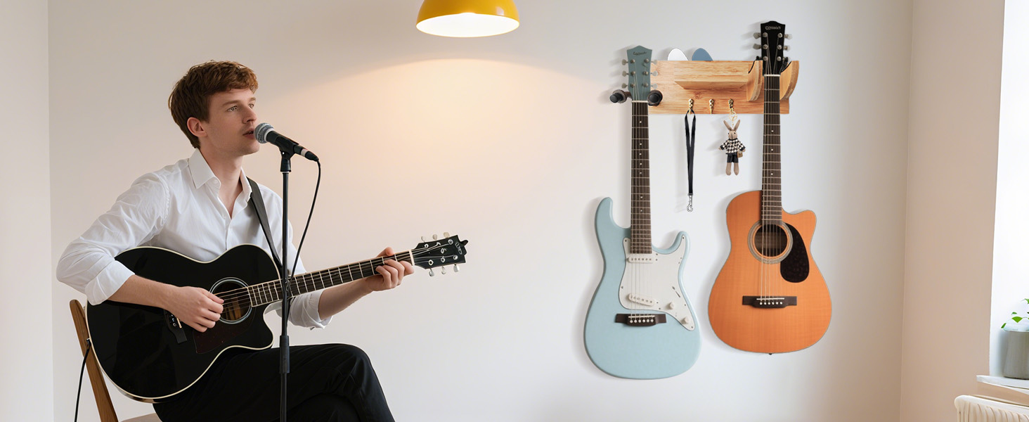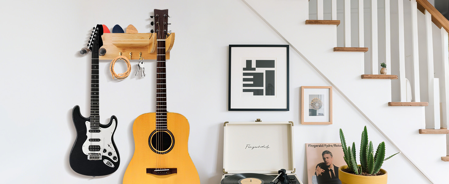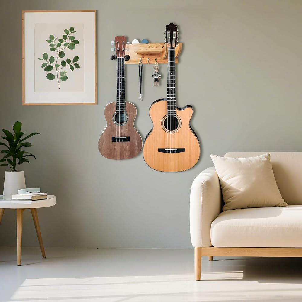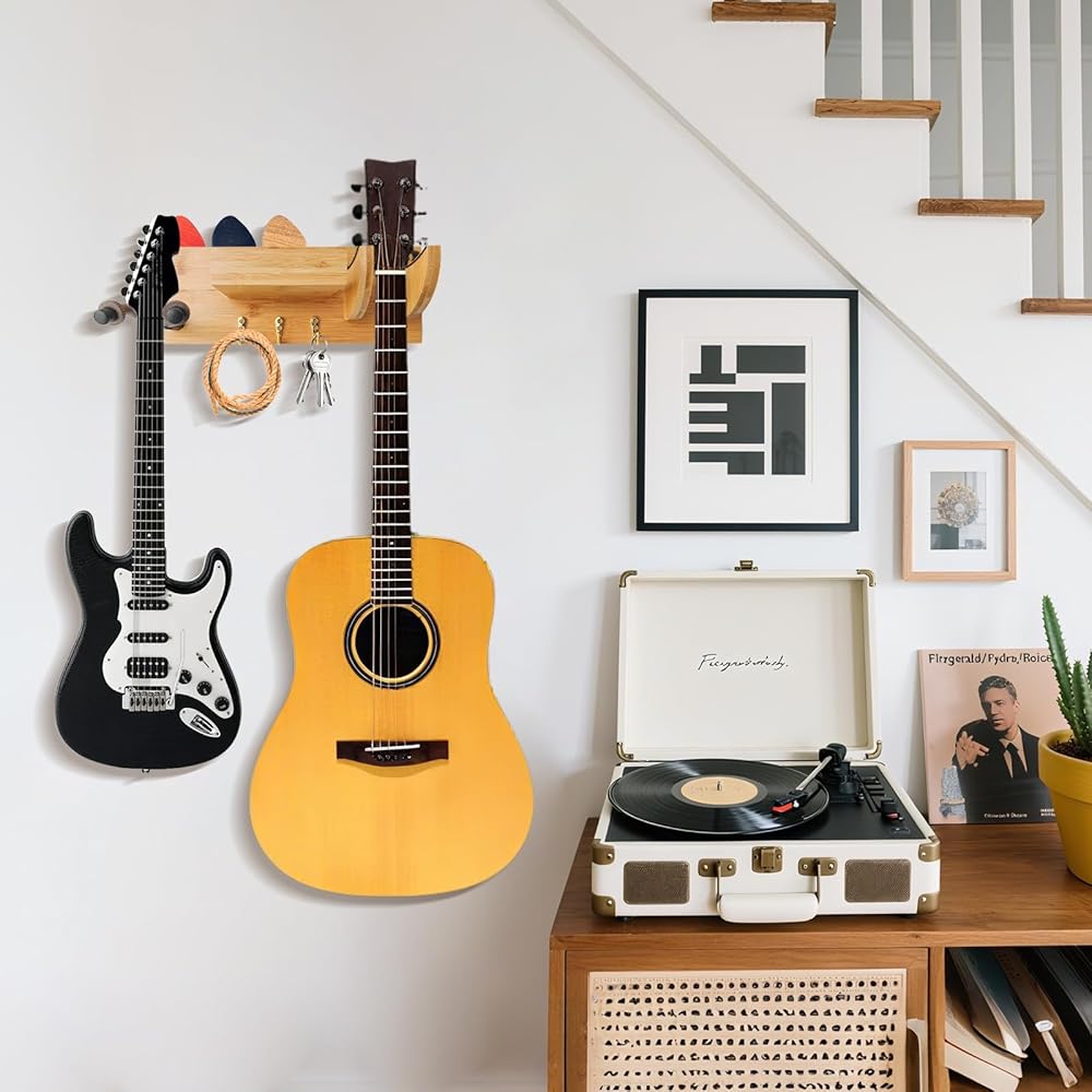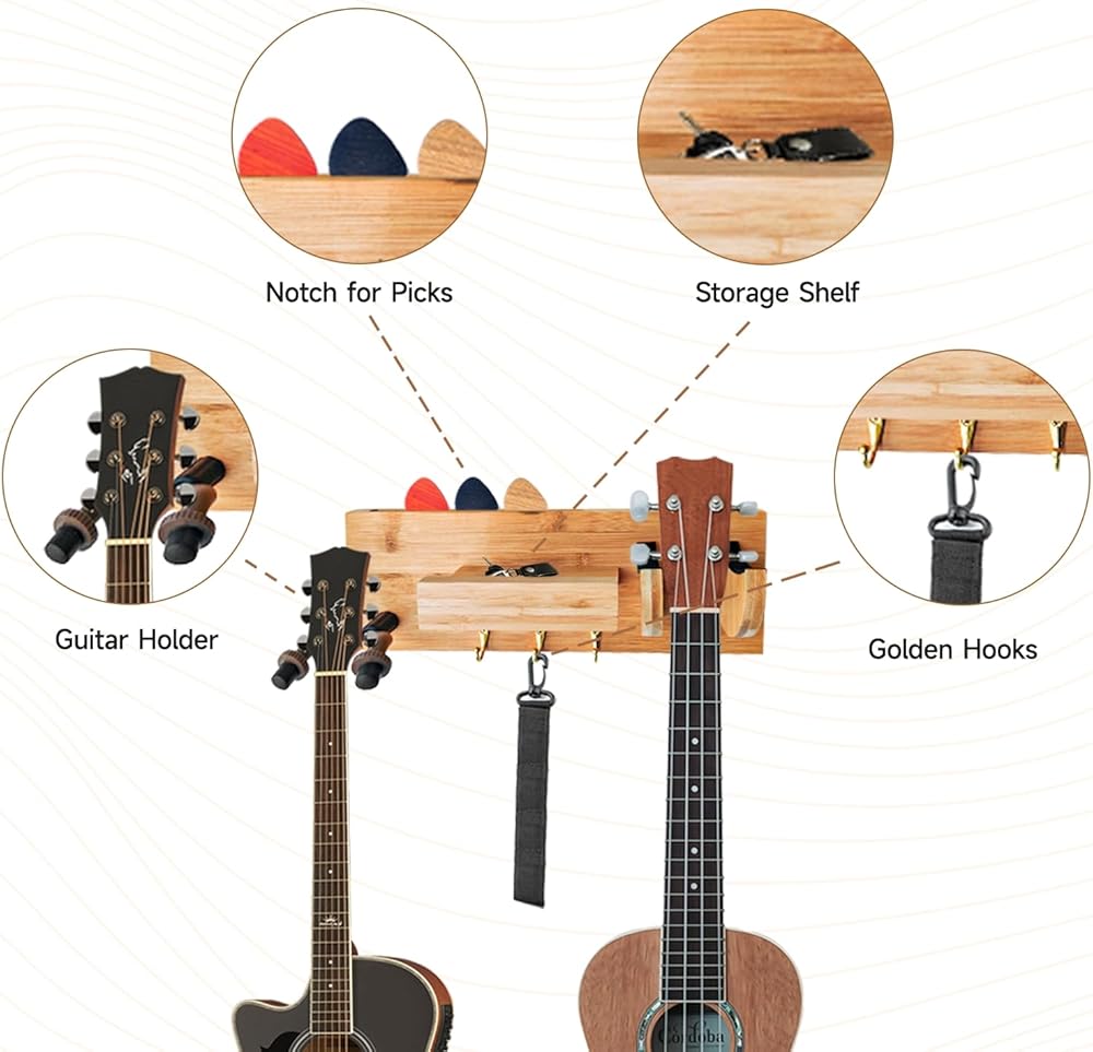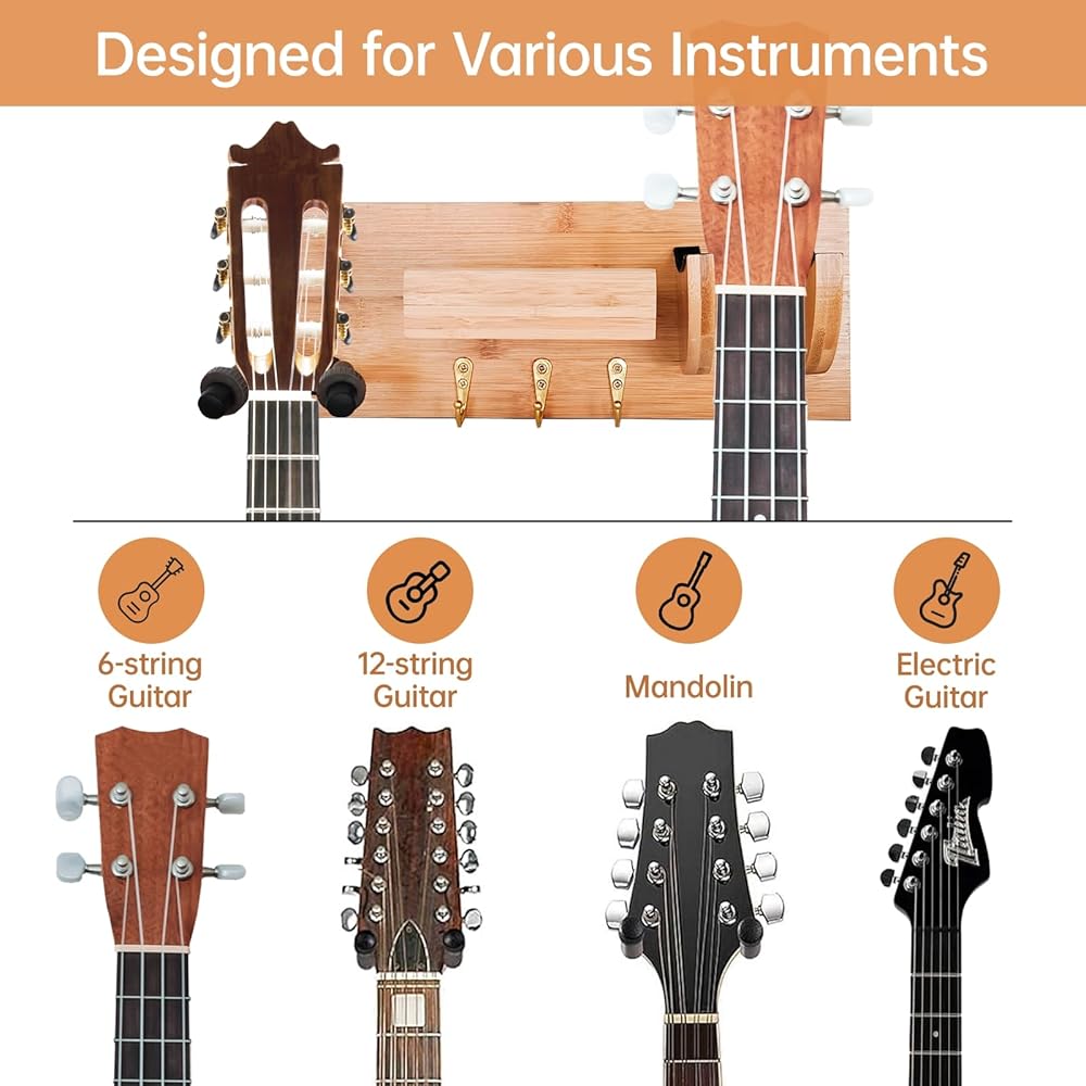 جبل الجيتار الجيتار الخيزران - شماعات رف الجيتار مع 3 خطافات وحامل اختيار ، شماعات الغيتار الخشبية للرفوف الصوتية ، الكهربائية ، الباص ، القيثارة ، الغيتار الملحقات