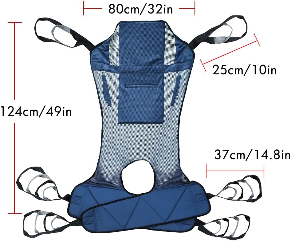 الحجم m شبك كامل الجسم شبك الرفع حبال ، دعم الرأس والظهر ، الرافعات نقل المرحاض ، الساقين المنقسمة مع فتحة كومود ، 5 مقابض ، 6 أحزمة ، رفع حبال متوافق مع مختلف المصاعد