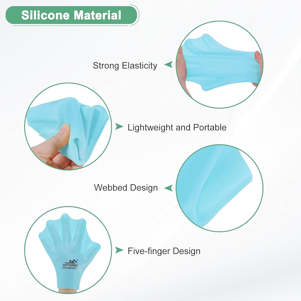 1. The swim gloves are made of silicone, which ensures the comfort, softness, and excellent elasticity of swimming gloves, and are lightweight portable, and reusable.