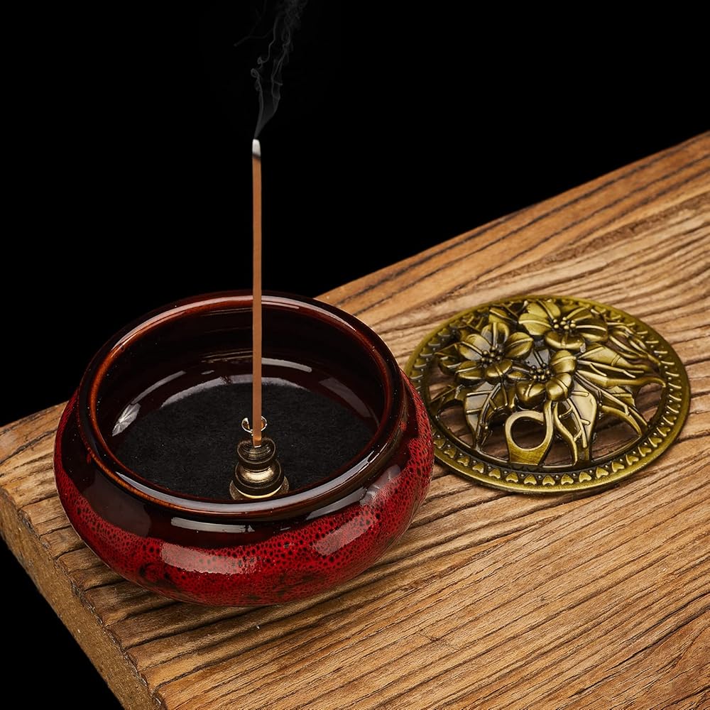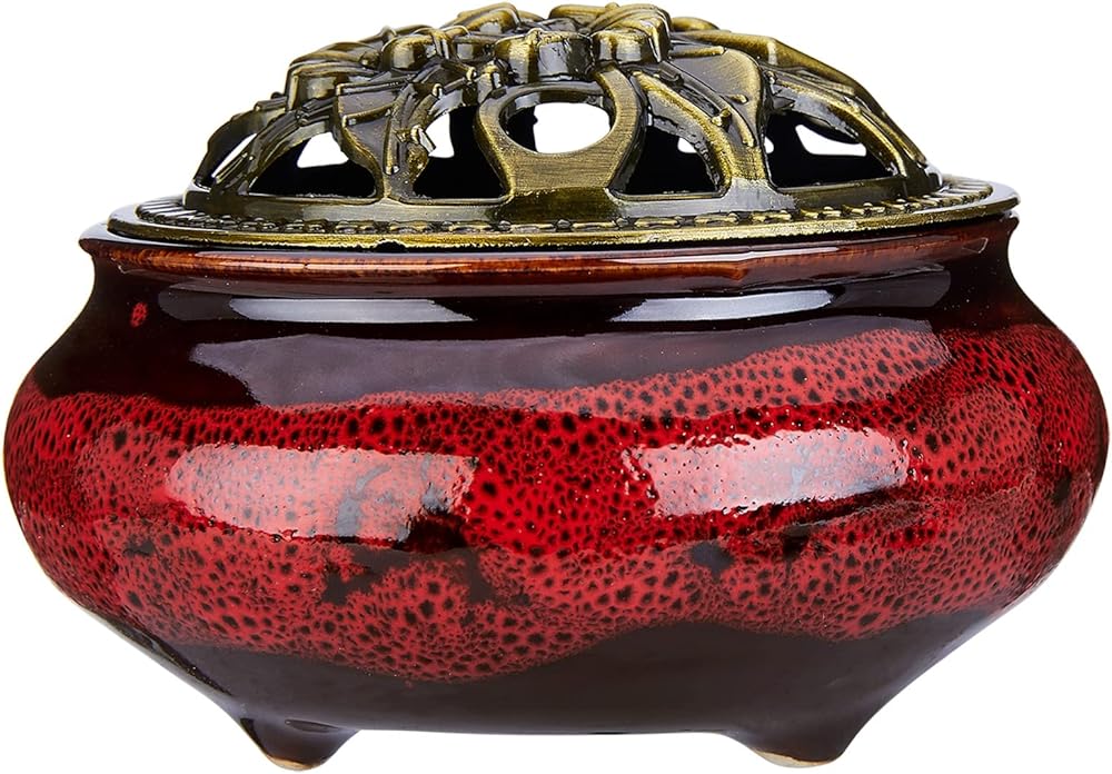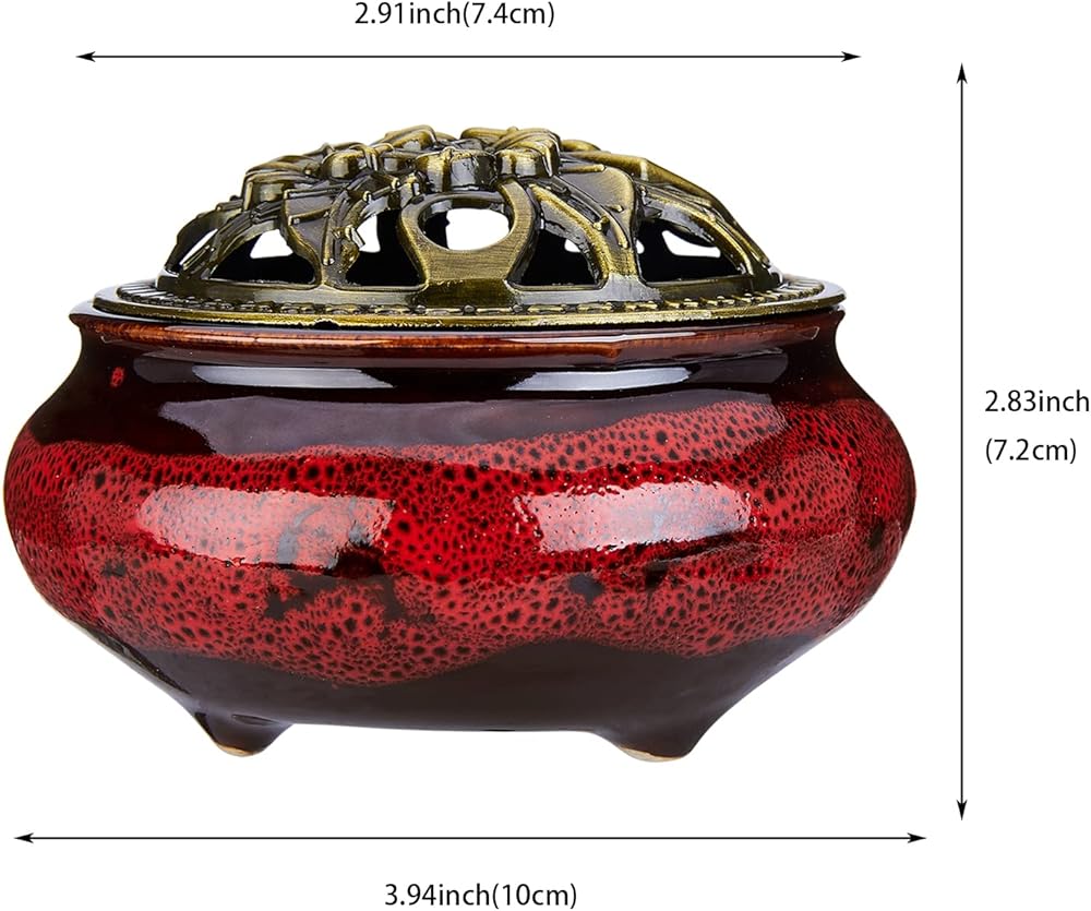 مبخرة سيراميك مع غطاء نحاسي وحامل بخور معدني لبخور خشب الصندل وبالو سانتو ومخروط المريمية واللبان من ميستو (احمر داكن)