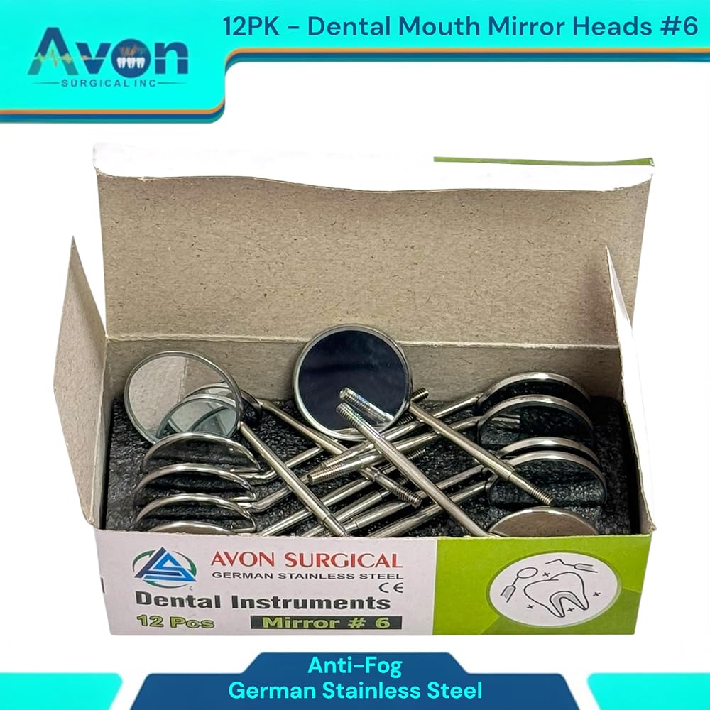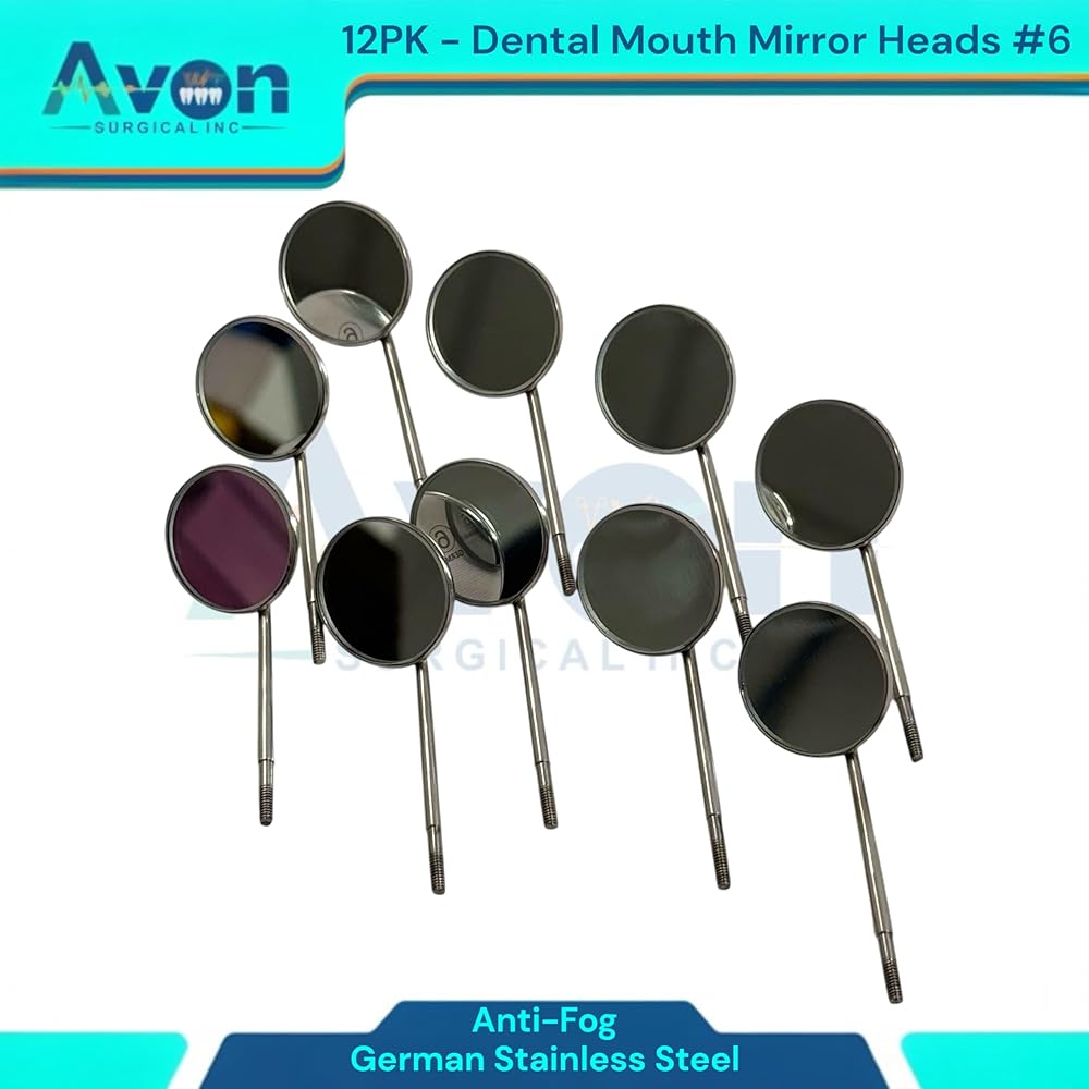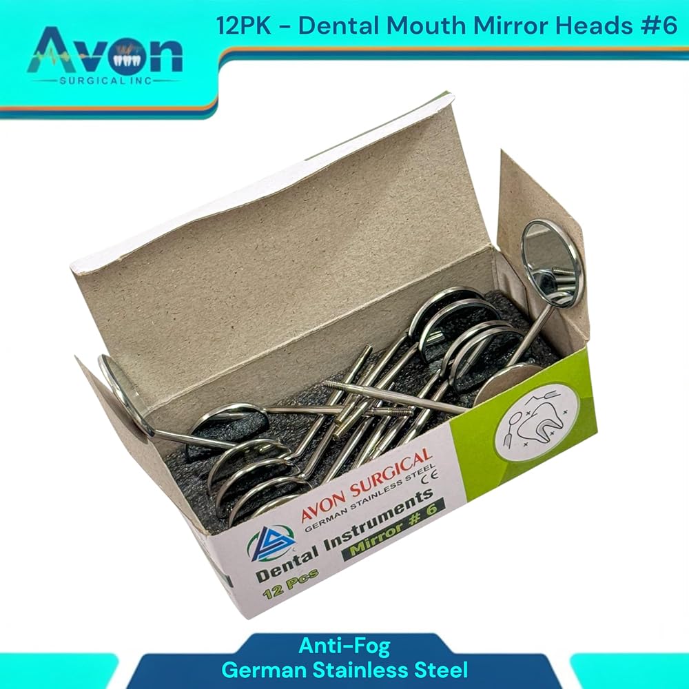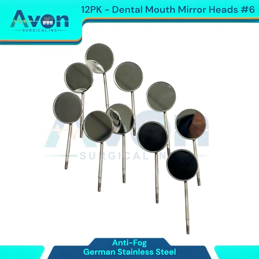 Cost-Effective Bulk Pack: This convenient set of 12 mirror heads offers excellent value, providing a reliable supply for busy practices, dental students, or individual professionals. Reduces procurement frequency and ensures you always have a fresh, sterile mirror readily available. Standard #6 Size & Cone Socket Design: Universal #6 mirror size provides optimal viewing for a wide range of dental procedures. The precision-engineered cone socket thread ensures a secure, wobble-free fit with all standard cone socket dental mirror handles, allowing for quick and easy replacement. Optimal Clarity & Reflection: Meticulously polished mirror surface delivers bright, crisp images for superior visibility, aiding in accurate diagnosis, detailed examination, and precise treatment. Essential for identifying small carious lesions, checking margins, and assessing soft tissues. Premium German Stainless Steel Construction: Crafted from German stainless steel, known for its exceptional durability, corrosion resistance, and ability to withstand repeated sterilization cycles (autoclave, chemiclave, dry heat). Guarantees long-lasting performance and hygiene.