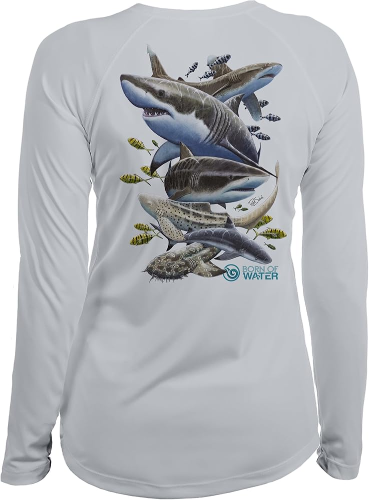 Born of Water Scuba Shark UV Shirt: Misunderstood BeautyMisunderstood Beauty depicts the creatures of the sea which have been given a notoriously mistaken reputation, sharks. From the immense power of the great white, to the wobbegong shark, a master of camouflage, sharks come in an array of colors, sizes, and shapes. This piece portrays an assortment of these unique species, including the oceanic white tip, great white, tiger shark, zebra shark, blacktip, and wobbegong shark.Having had the opportunity to dive with some of the ocean's largest predatory sharks has shown me the true nature of these creatures. They are intelligent and inquisitive, not the man eating monsters which we are so often led to believe. UPF 50+ UV Sun Protection 4.1 oz 100% Microfiber Performance Fabric Moisture Wicking Odor Resistant Resists Snagging This Born of Water shark shirt is designed with comfort and style in mind. Our shark shirt offers UV protection and is durable for the scuba lifestyle. Here at Born of Water scuba apparel we stand behind our products and guarantee the quality of our shark shirt. If you ever have a problem with any of our products, give us call us.