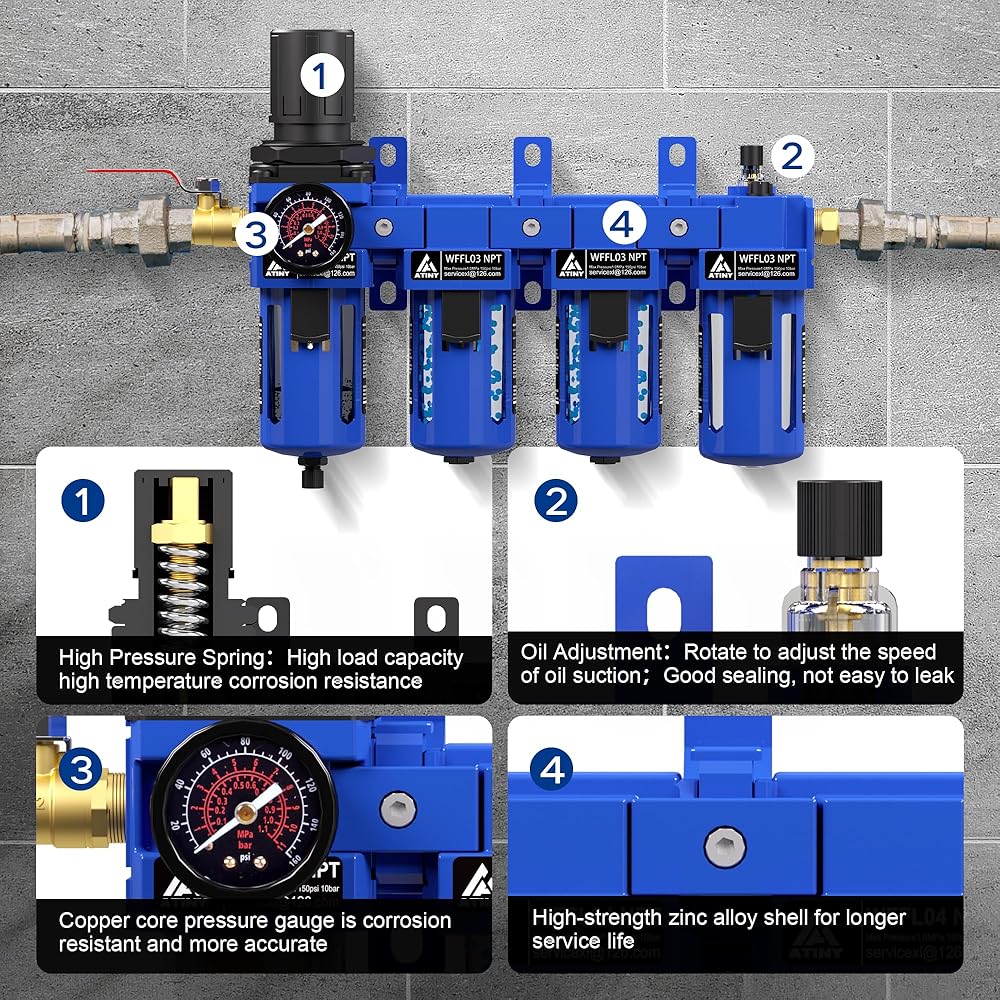 Filtration and Lubrication:Equipped with a 5u brass filter element, they efficiently remove moisture, particles, and oil to deliver clean while the oilling cup ensure gas lubrication, oiling air to your pneumatic equipment.