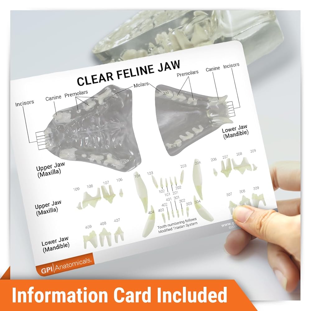 • نموذج الفك القطط: يعرض GPI Anatomicals نموذجًا دقيقًا للحجم الكامل بالحجم العلمي الذي يصور فكًا يتسم بالحجم الكامل. مصنوع من مواد واضحة ، يجب التعامل مع النموذج بعناية ؛ قد تنكسر إذا سوء المعاملة أو إسقاط