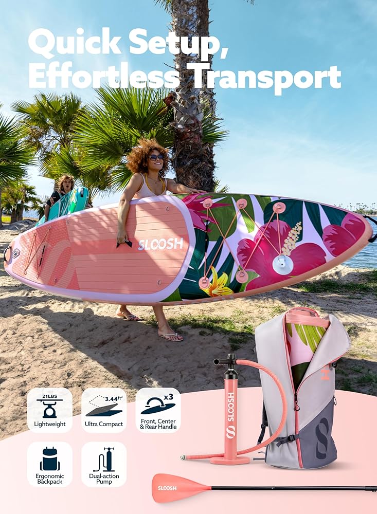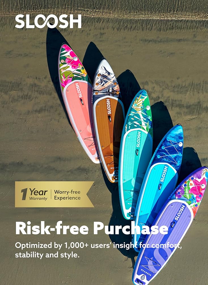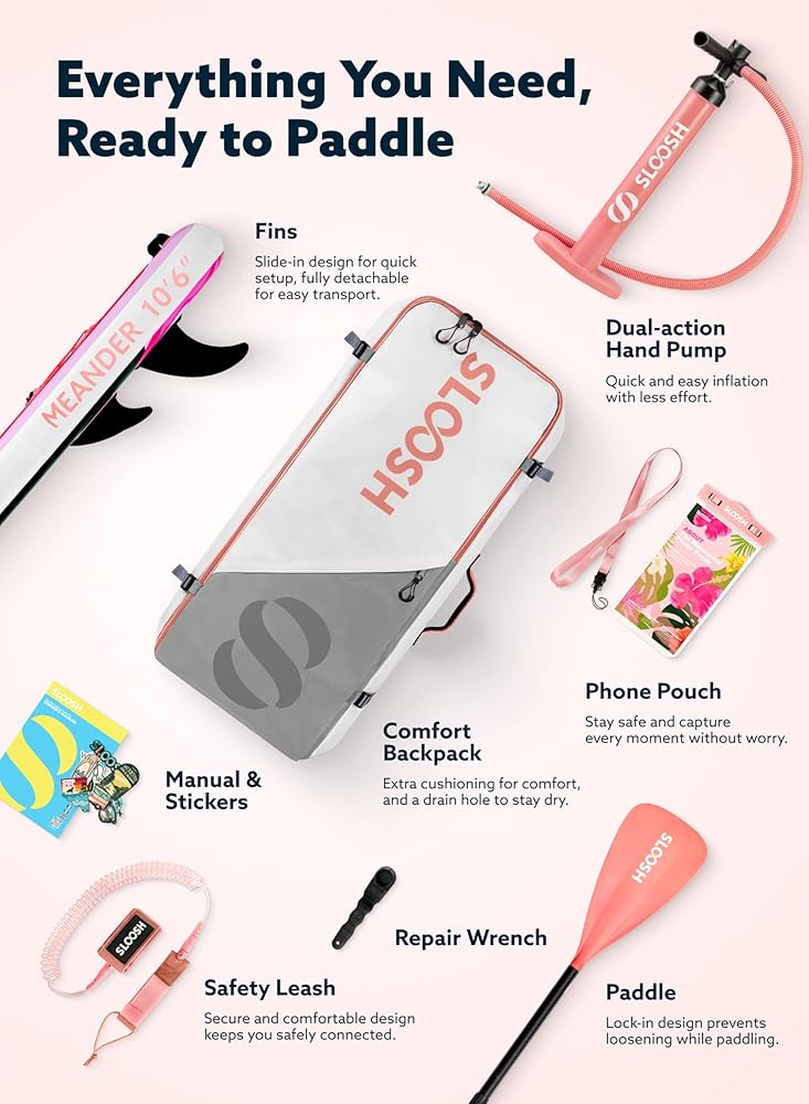 • Complete Kit + 1-Year Warranty – Everything You Need to Start: Your Meander SUP comes with a premium paddle, dual-action pump, ankle leash, waterproof phone pouch, tri-fin system, and padded backpack. Backed by a 1-year limited warranty and fast, friendly customer support, your SLOOSH paddle board adventure is worry-free. We've got your back, so you can focus on the journey.