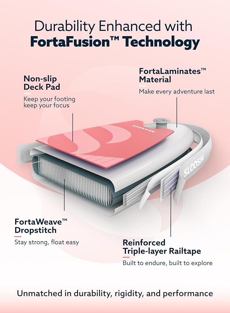 • FortaFusion Build + Max 20 PSI – Rigid & Long-Lasting: Our proprietary FortaFusion Technology build with double-layer mesh-reinforced sidewalls create a board that's tough enough for bumps and scrapes, yet light enough to carry with ease.. Inflate to 12–15 PSI for best performance, or up to 20 PSI when you want extra rigidity.