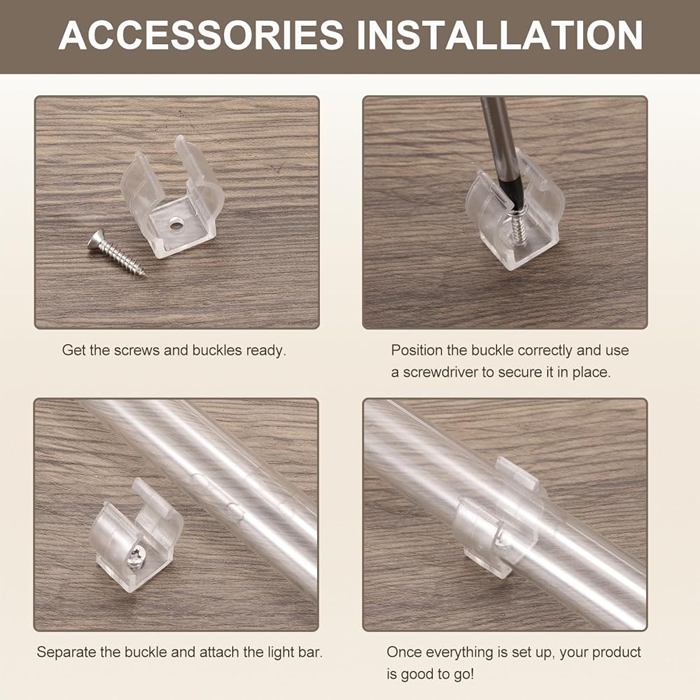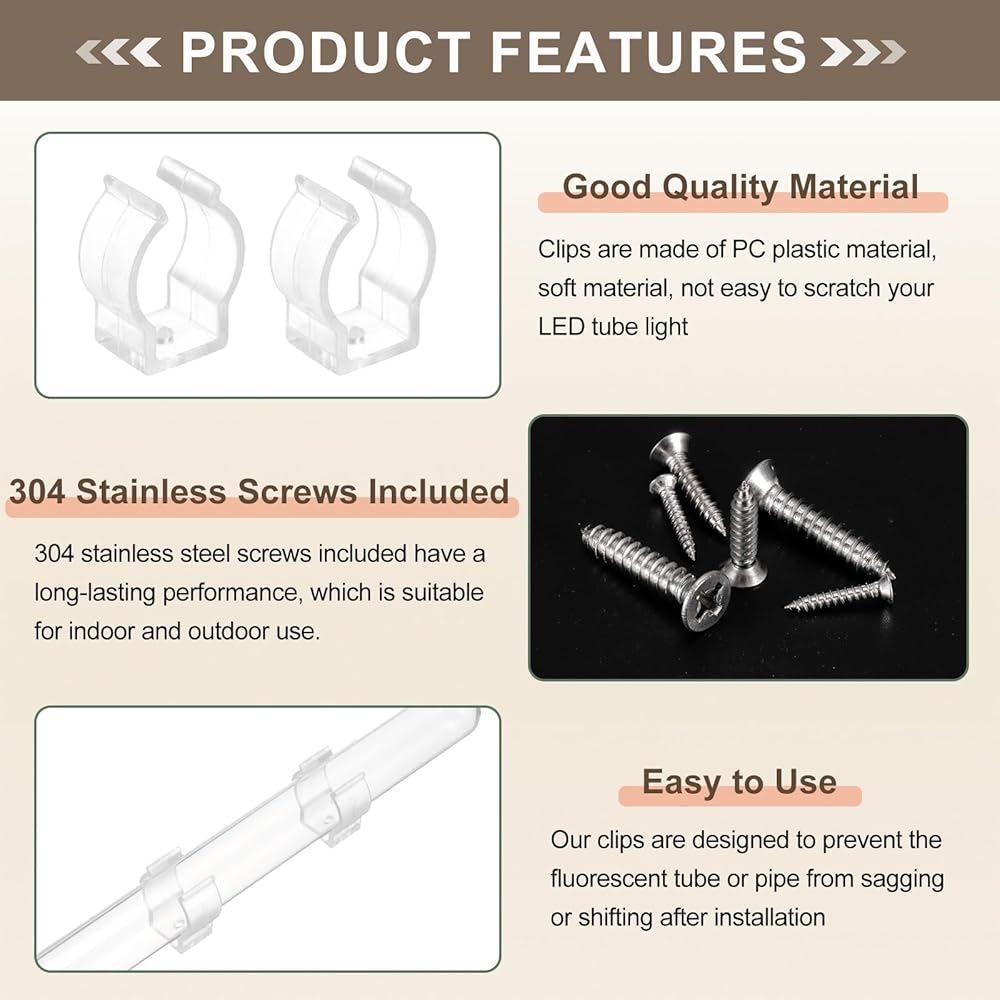 مقاطع مصنوعة من مواد بلاستيكية للكمبيوتر الشخصي ، والمواد الناعمة ، وليس من السهل خدش ضوء أنبوب LED الخاص بك ، كما أن لديها أداء عزل جيد أيضًا. أيضًا ، تحتوي مسامير الفولاذ المقاوم للصدأ 304 على أداء طويل الأمد ، والذي يمكن أن يساعدك في القيام بمهمة التثبيت بشكل جيد.