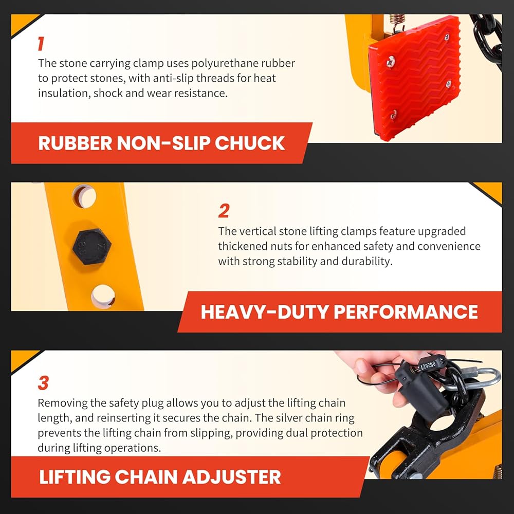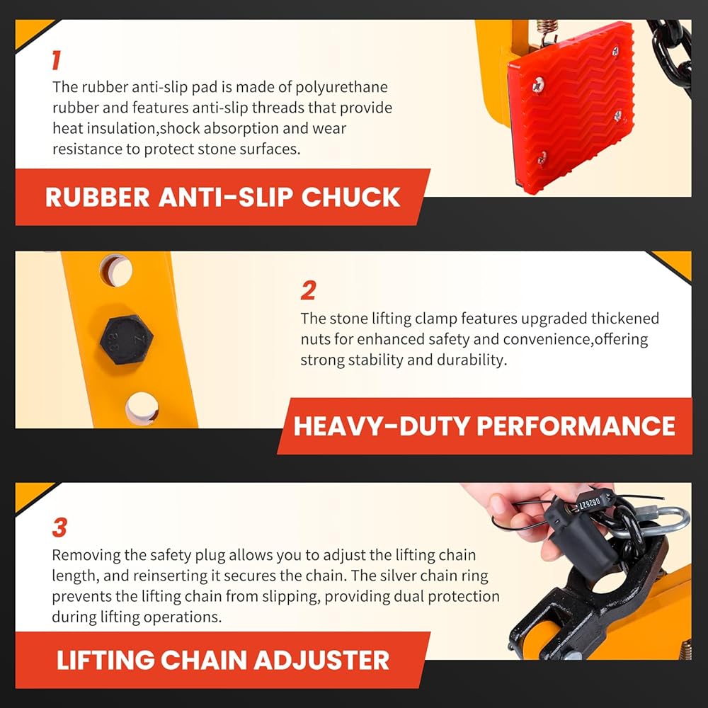 حماية السلامة السهلة للاستخدام: يتميز مشبك رفع الجرانيت بتوصيل أمان لضبط طول السلسلة السهل-PULL لضبطه ، ثم إعادة إدراج لتأمينه. المشابك الحجرية الرأسية هي حلقة الفضة تمنع الانزلاق للحماية المزدوجة. يزيد تصميم خرطوم المطاط في رفع الخدمة الشاقة من الاحتكاك ويمتص الصدمات ، ويحمي الأسطح الحجرية أثناء الرفع
