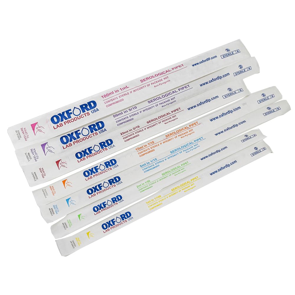 These sterile serological pipettes by Oxford Lab Products are designed for precise liquid handling in laboratory settings. With a volume capacity of 2 mL, these green pipettes come individually wrapped for convenience and sterility maintenance. The pack contains 500 pipettes, ideal for high-throughput applications and ensuring a long-lasting supply for your lab. The sterile nature of these pipettes makes them suitable for cell culture work, PCR, and other sensitive applications where contamination must be avoided. Each pipette is calibrated for accurate dispensing, allowing for reproducible results. Whether you are working in research, diagnostics, or educational labs, these serological pipettes offer reliability and performance to meet your liquid handling needs with ease.