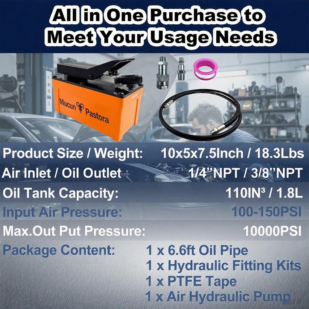 • This air-powered hydraulic pump boasts a maximum adjustable pressure of 10,000 PSI, making it suitable for all 10-ton applications. The pump includes a 98 cubic inches/1.6 liters fuel tank and a 3/8" NPT quick hydraulic coupler with a dust cap for easy connections.
