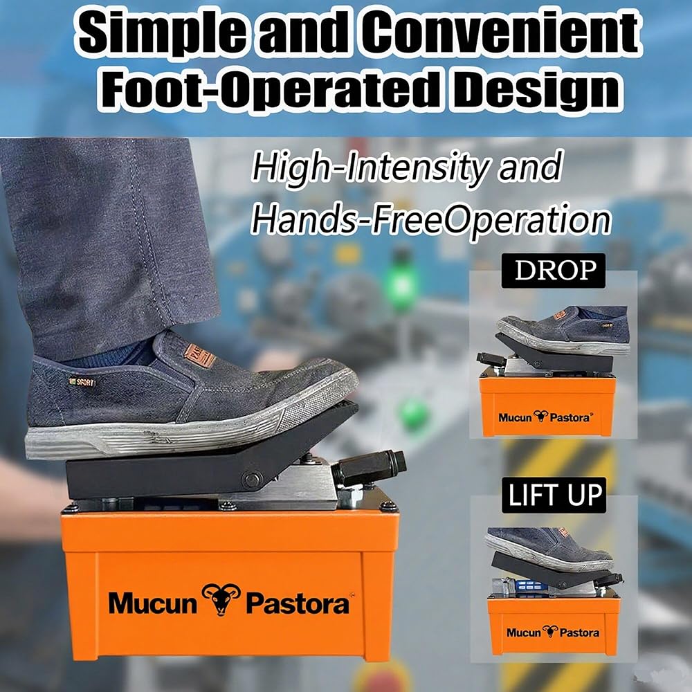 • The air over hydraulic pump features a user-friendly, foot-actuated design that allows for easy control and operation, saving time and effort with its powerful and adjustable pressure. The built-in internal relief valve safeguards the hydraulic components regardless of the hydraulic pressure.