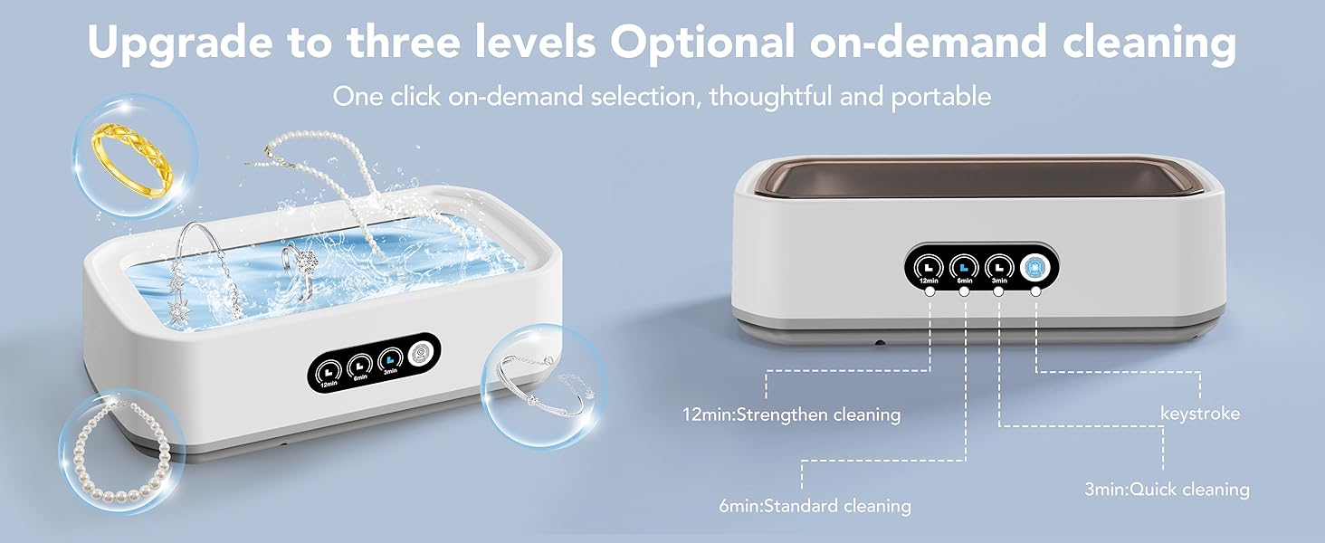 Smart Touch Control - Electric Jeweler Cleaner Vultrasonic مع إعدادات 3 و 6 و 12 دقيقة ، مما يسمح بدورات تنظيف مخصصة لعناصر مختلفة. التوقف التلقائي عند الوصول إلى الوقت.