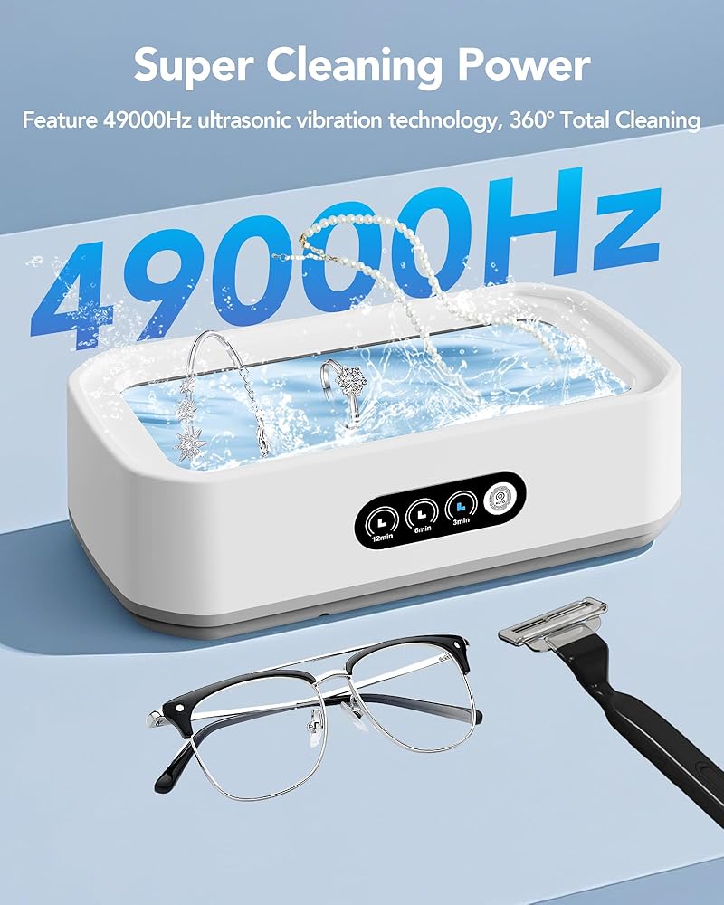 قوة التنظيف الفائقة - تقدم تكنولوجيا التنظيف بالموجات فوق الصوتية المتقدمة 49000 هرتز تنظيفًا عميقًا ومجهريًا للمجوهرات والنظارات والحلاقة وأطقم الأسنان ، وإزالة الأوساخ واستعادة اللمعان (إضافة محلول عامل التنظيف بالموجات فوق الصوتية يمكن أن يحقق نتائج تنظيف أفضل)