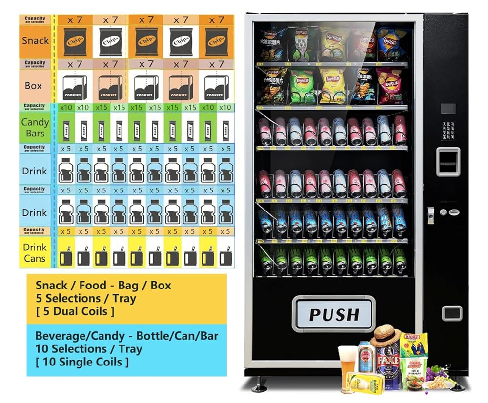 - Large vending capacity, capable of vending cold soda, candy, chips and snack