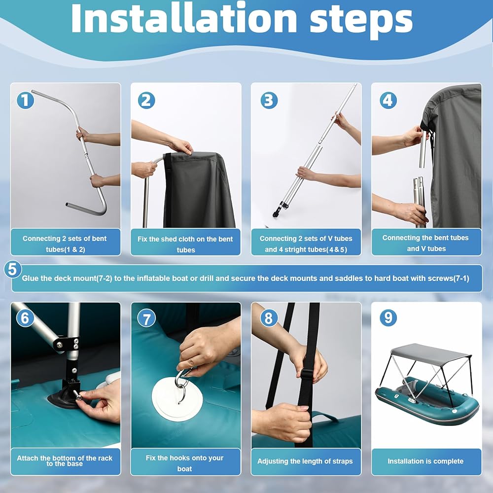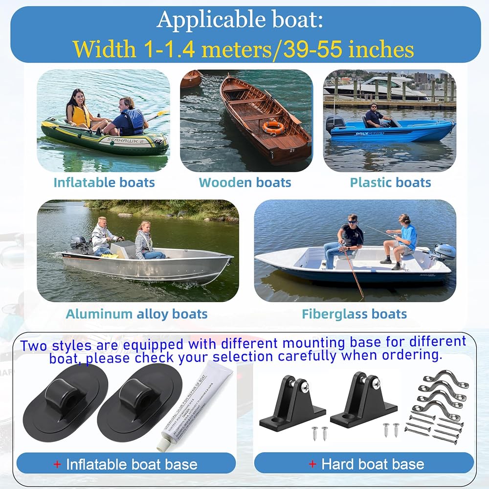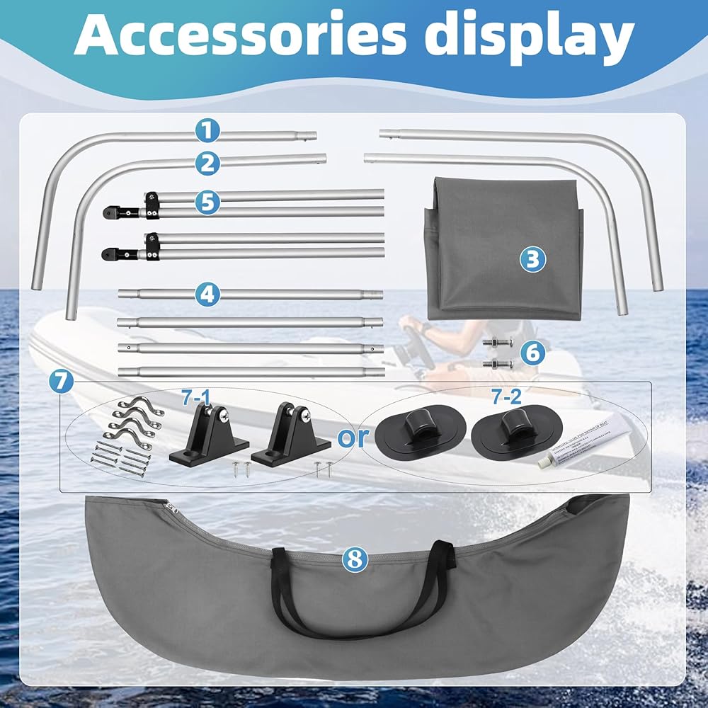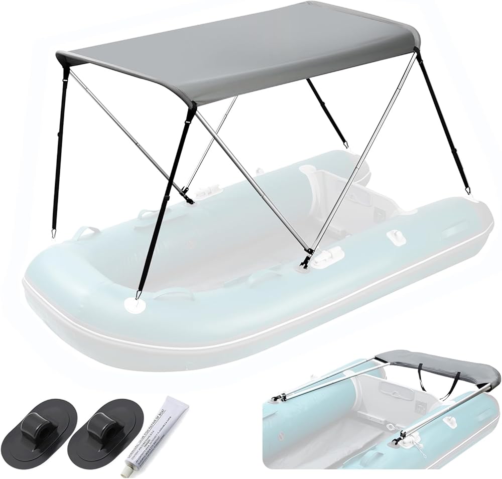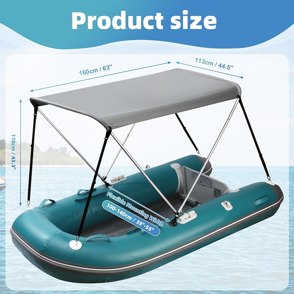 Enhance your boating experience with this versatile 2-bow bimini top canopy designed to provide reliable sun protection. The grey canopy measures 63 inches long by 44.5 inches wide, making it perfectly sized for boats between 39-55 inches in width. This complete kit includes all necessary mounting hardware, storage boot, and adjustable straps for secure installation. Available with two mounting options - an inflatable boat base or hard boat base - this bimini top accommodates various vessel types including inflatable, wooden, plastic, aluminum alloy, and fiberglass boats. The adjustable straps allow for perfect tensioning, while the included storage boot keeps your canopy protected when not in use. Transform your boat into a more comfortable space with this practical sun shade solution that combines durability with easy installation.