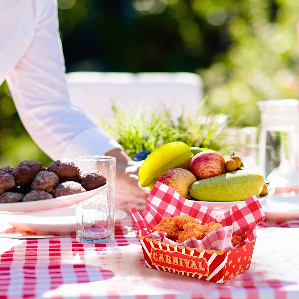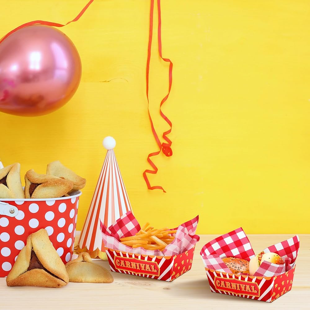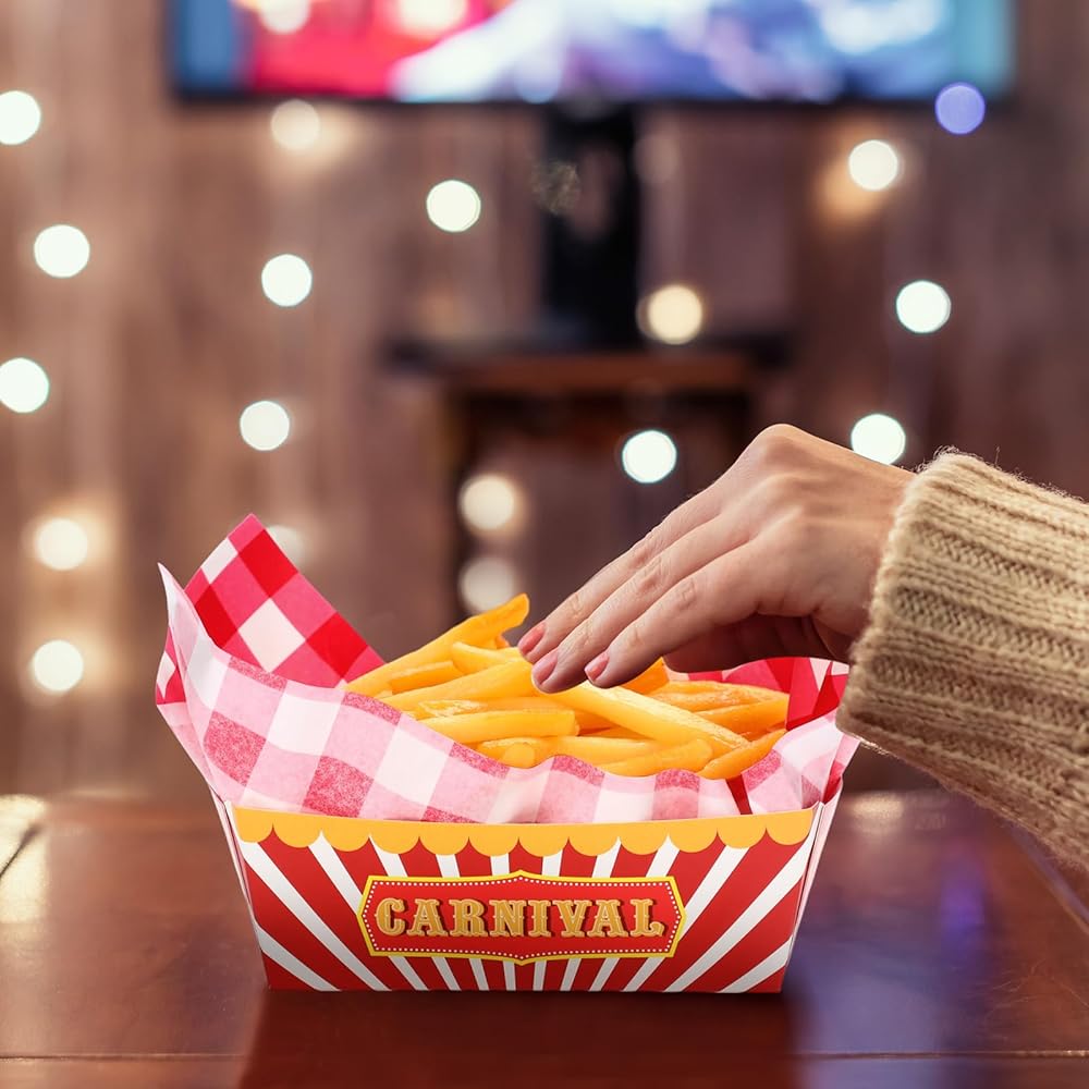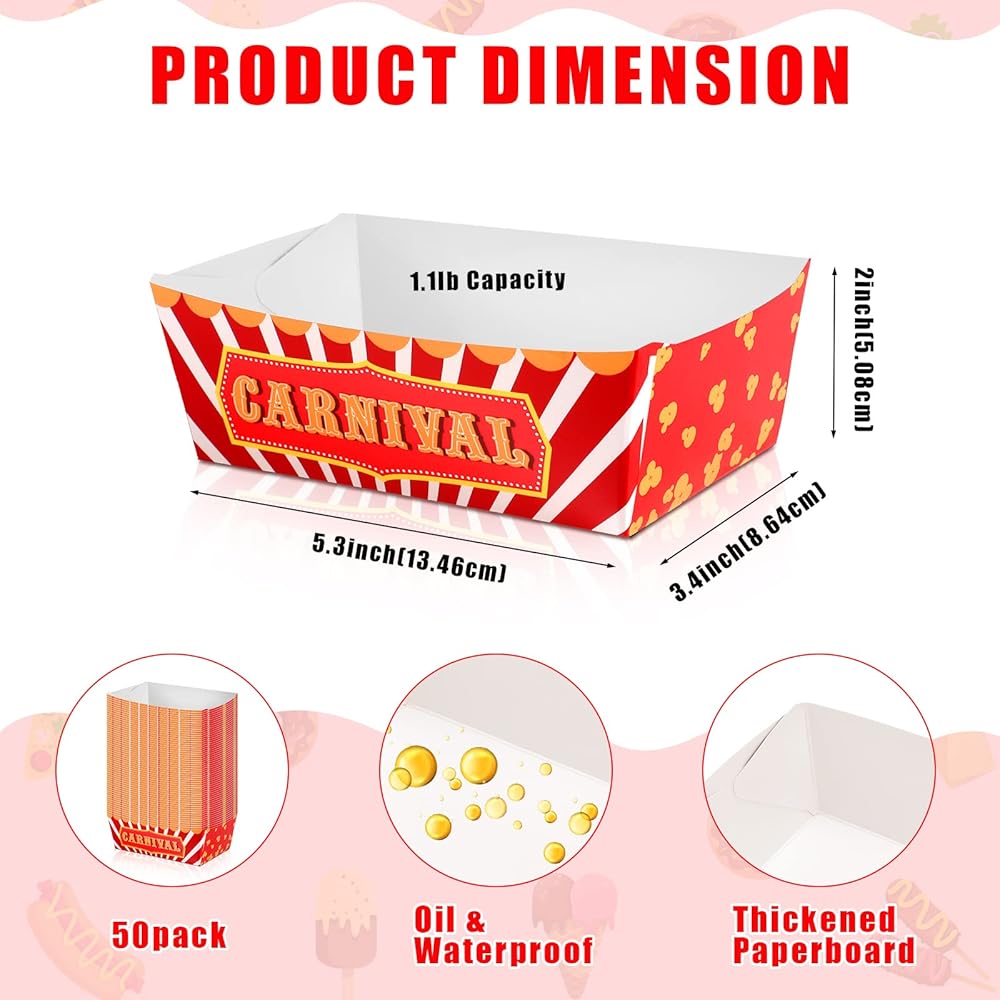 صواني طعام كرنفال كافية: هناك 50 قطعة من صواني الطعام كرنفال مع أقصى قدرة غذائية تبلغ 1.1 رطل ، و 50 قطعة من ورق الشمع الكرنفال 12 × 8 بوصات ، وكبيرة بما يكفي لعقد رقائقك المفضلة ، والحلويات ، والحلويات