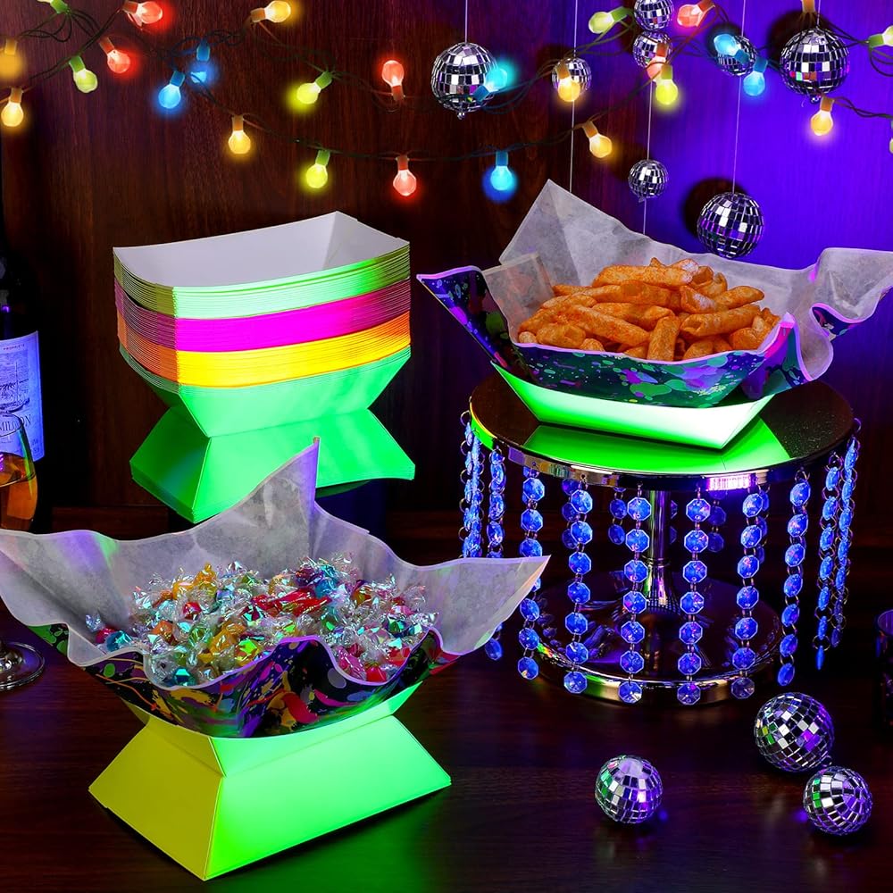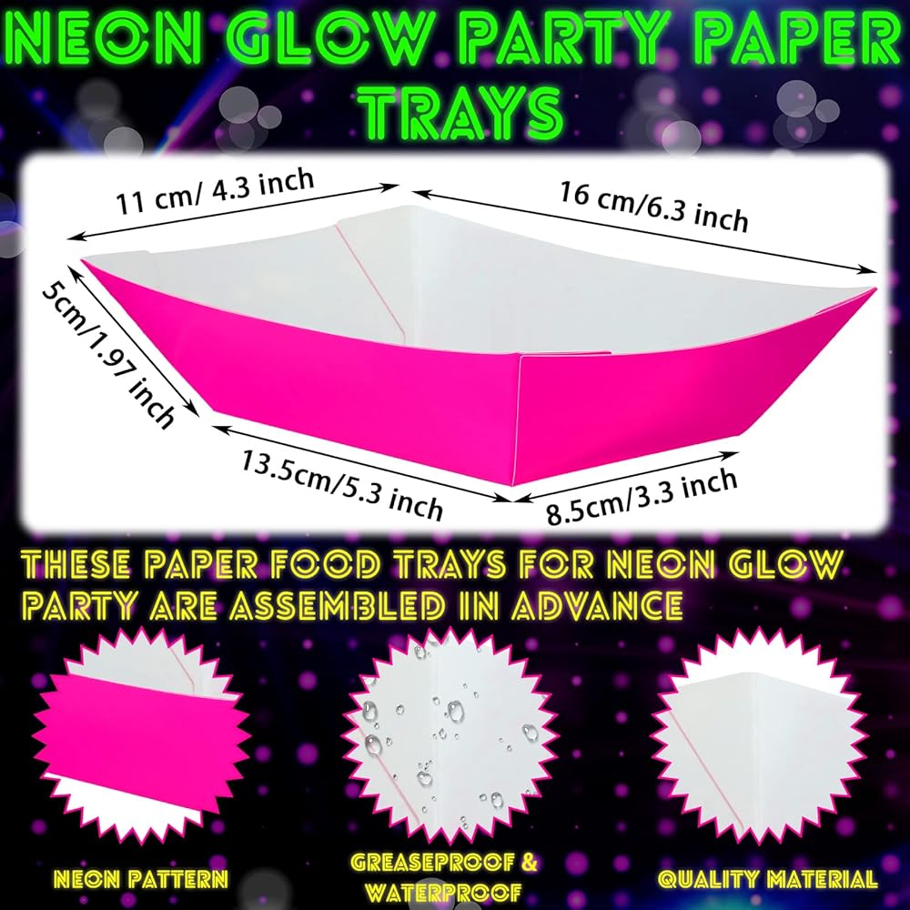 Lallisa 120 PCS Neon Glow Party Supplies يقدم 60 Neon Paper Food Ranks قوارب طعام عيد ميلاد يمكن التخلص منها مع أوراق الورق الشمع التي تقدم صوانيًا لتوهج بوفيه الطعام في The Dark Party Decorations