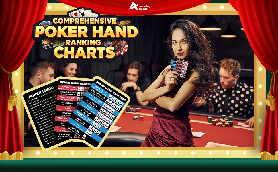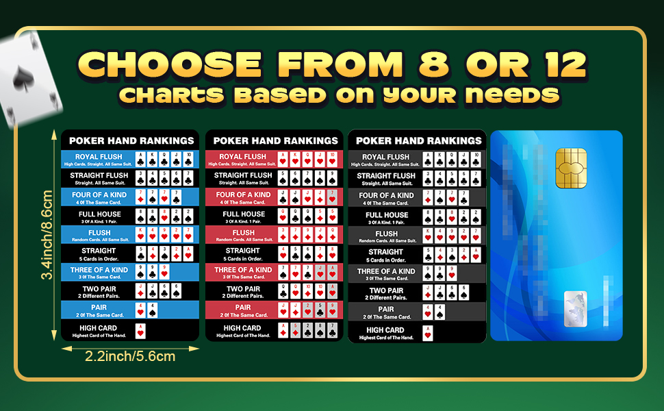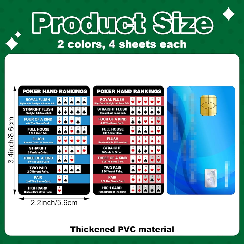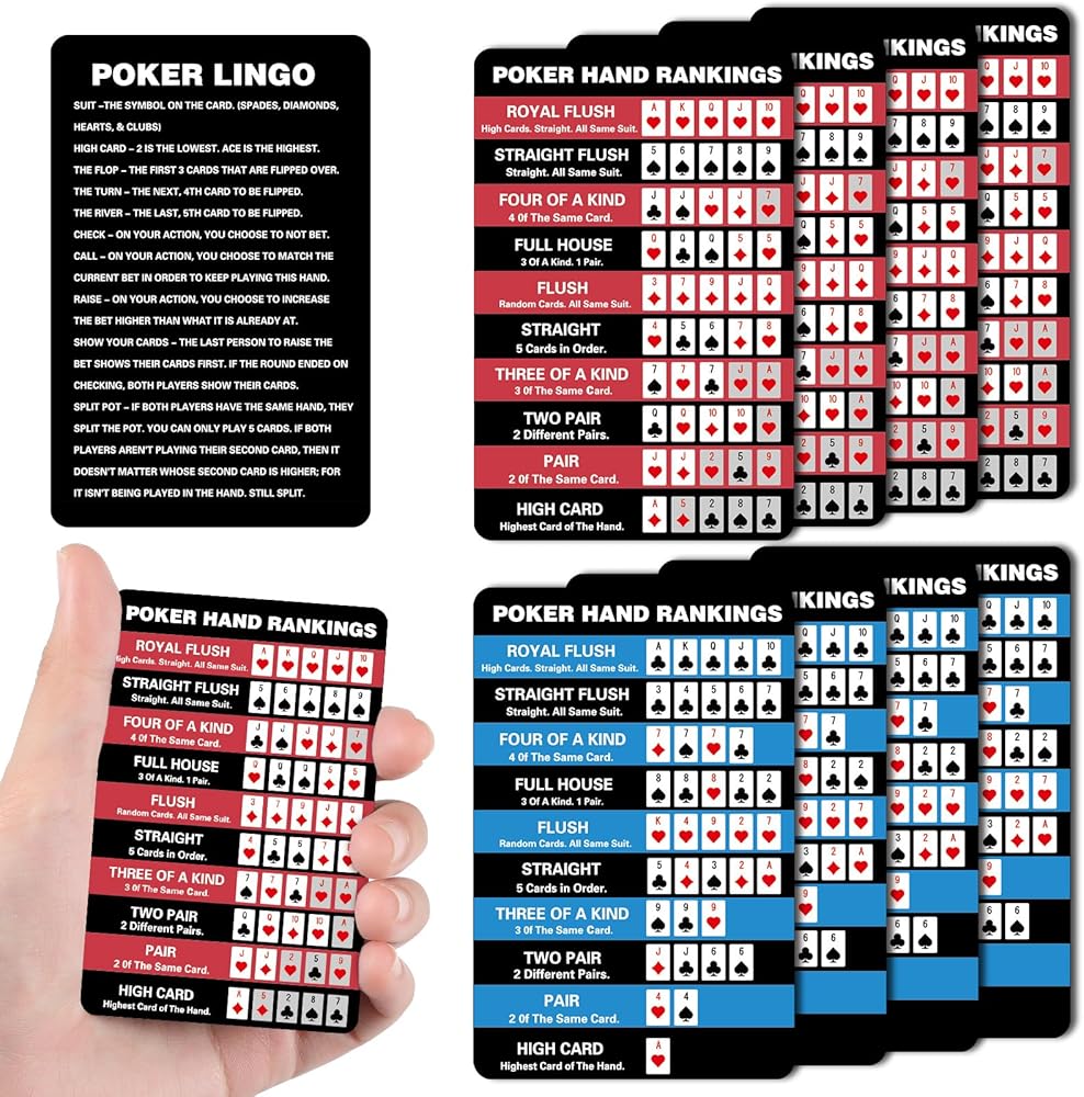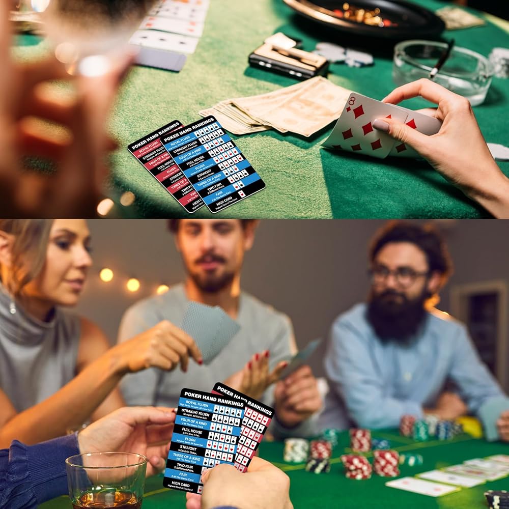 • مخططات ترتيب اليد في لعبة البوكر: تتلقى 8 مخططات ترتيب يدوية من لعبة البوكر البلاستيكية ، تحتوي على كل ما تحتاجه للعب البوكر من خلال فهم مجموعات اليد الواحدة وقيمها وماذا لديك وما قد يكون لدى اللاعبين الآخرين في طاولتك