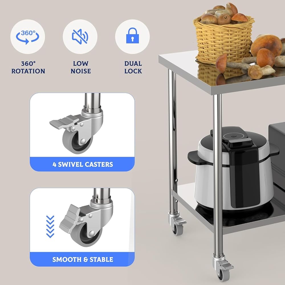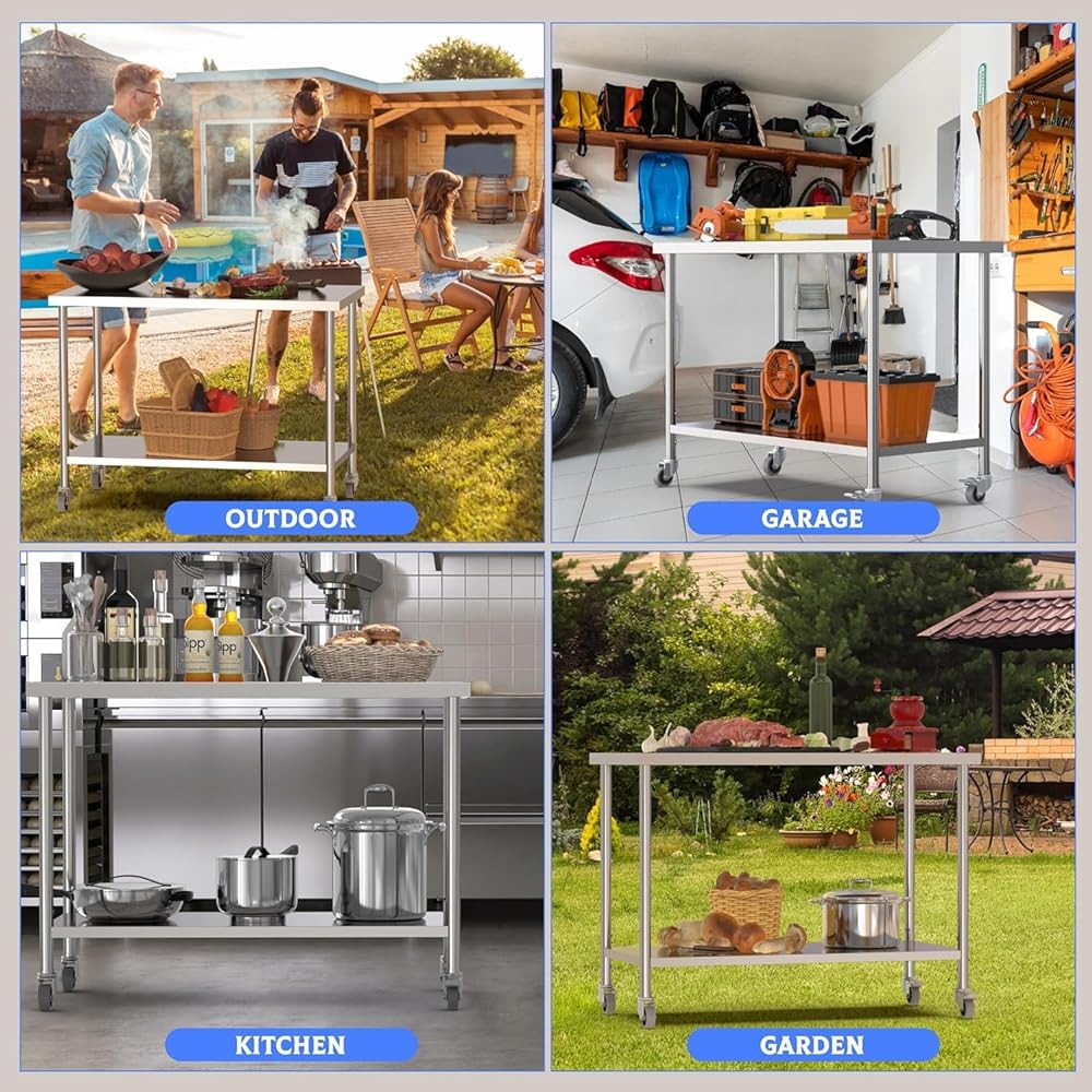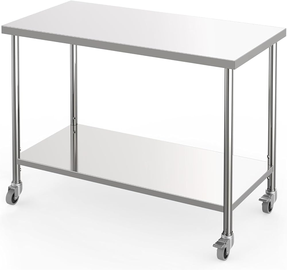 48 "× 24" طاولة الإعدادية من الفولاذ المقاوم للصدأ مع عجلات قابلة للتعديل وعجلات قابلة للقفل | سطح عمل معدني ثنائي المستوى للمطعم أو المطبخ أو المرآب أو الاستخدام في الهواء الطلق