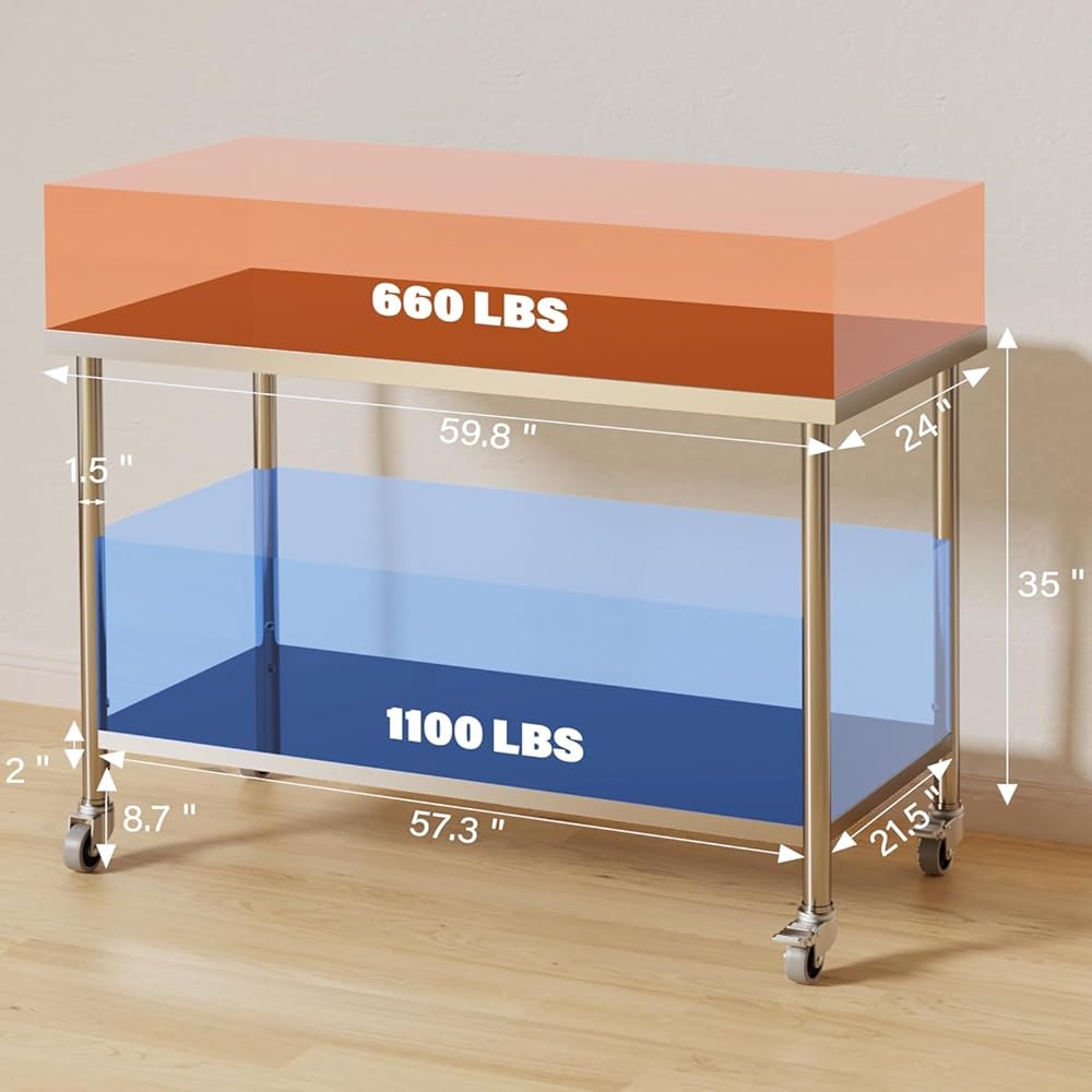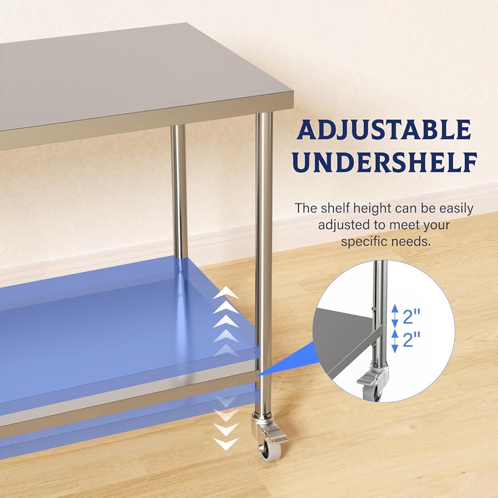 60" x 24" Stainless Steel Prep Table w/ Adjustable Undershelf & Lockable Wheels | Dual-Level Metal Work Surface for Restaurant, Kitchen, Garage, or Outdoor Use​