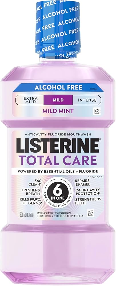Give your mouth complete oral care with Listerine Total Care Alcohol-Free Fluoride Anti-cavity mouthwash. Listerine Total Care Alcohol-Free oral rinse provides the same six dental hygiene benefits in one as Listerine Total Care Fluoride Anticavity Mouthwash, but in a less intense, alcohol-free mouthwash formula. Provides 2.4X the fluoride uptake of an alcohol-free, pH-neutral fluoride rinse* *Compared to a pH-neutral fluoride rinse (0.05% NaF). It freshens breath, kills 99.9% of germs that cause bad breath, with 5x more cleaning power ** From the #1 dentist-recommended brand of over the counter mouthwashes, this mouthwash for bad breath in Fresh Mint flavor gives your mouth a clean feeling you can taste. *In a lab study ** vs brushing and flossing alone based on bad breath germs