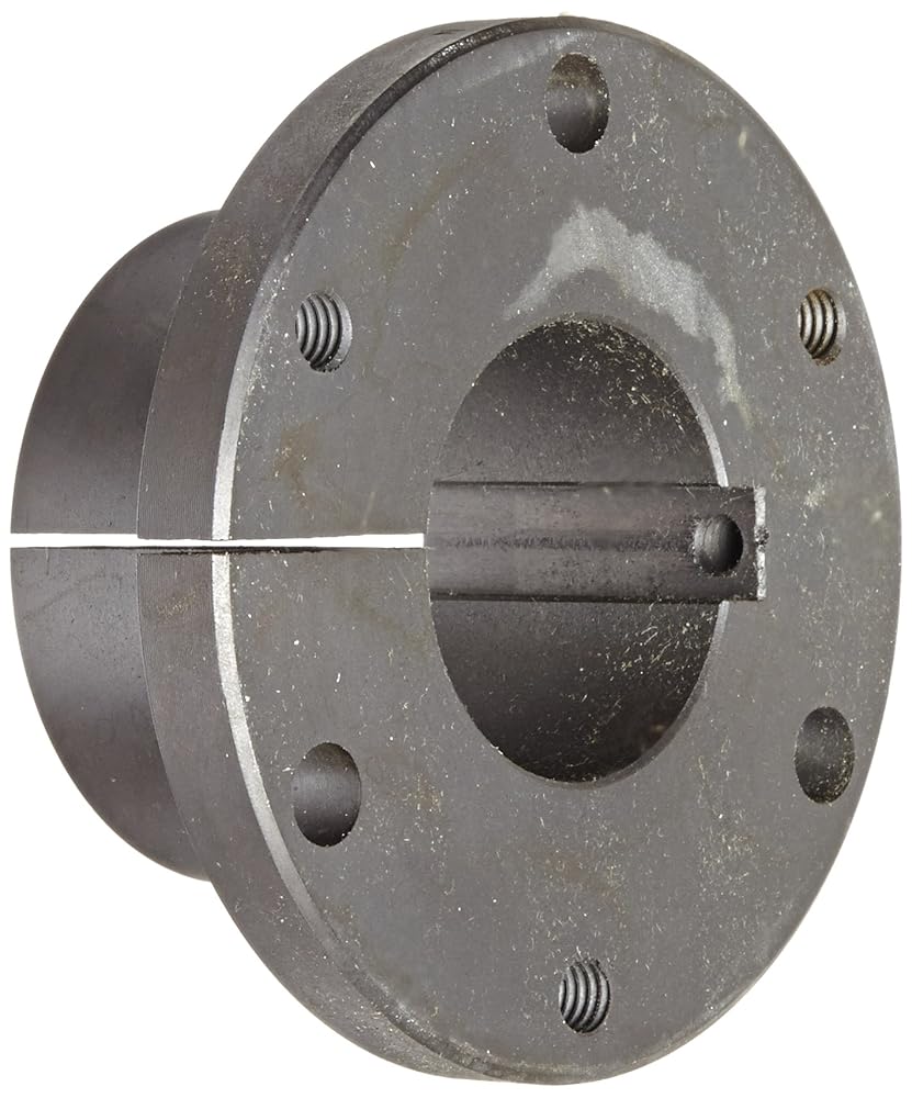 This TB Woods Type SF Sure-Grip quick disconnect bushing with a torque capacity of 11,000 in-lbs is made of cast iron and is used for mounting a quick disconnect pulley, sheave, or sprocket on a drive shaft. It is split through the flange and taper to provide strong clamping on the shaft. The bushing is made of cast iron for resistance to wear, galling, and corrosion. It is keyed to the shaft to prevent the shaft from rotating in the bushing, and it has a set screw over the keyway to help keep the key in place on vertical shafts and with vibrating loads. This quick disconnect bushing is used in automobiles, construction equipment, agricultural machinery, and home appliances, among others.