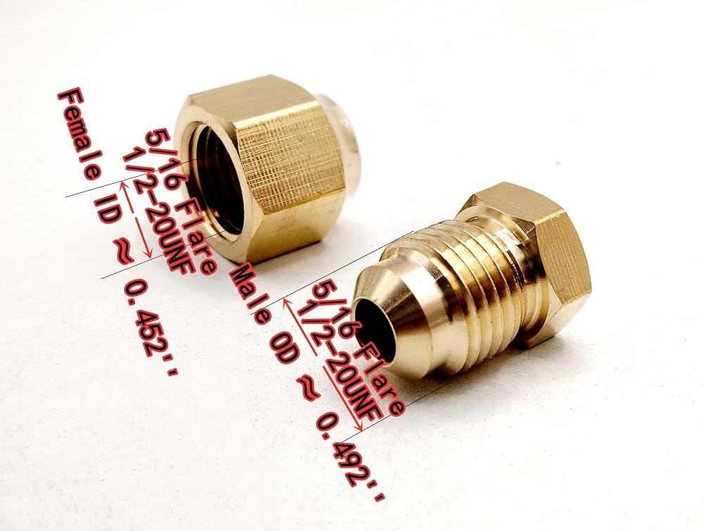 Compact Size: 5/16'' Flare (Thread size is 1/2-20 UNF) Measuring approximately: Female thread ID is about 0.452'' , and Male thread OD is about 0.496''