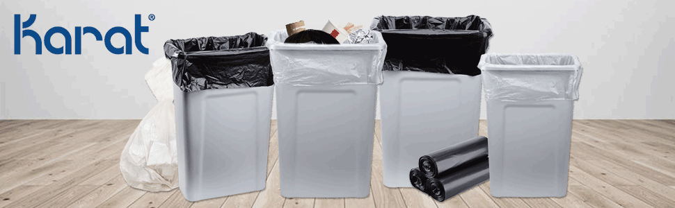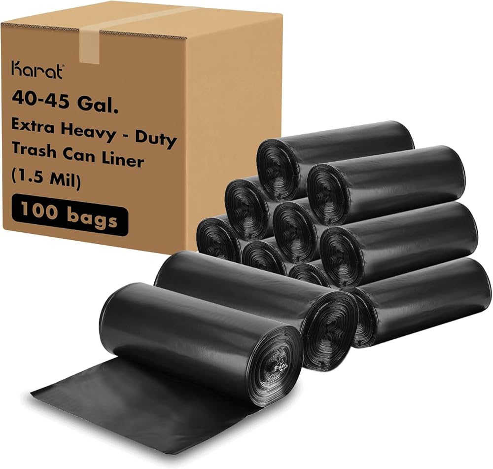 Karat low-density, 40-45 gallon trash can liners are ideal for heavy trash, debris and is strong enough to hold sharper objects. They are opaque black, so it can help hide the contents within the bag. These 40” x 46” liners can be used in a variety of areas like kitchens, restaurants, hotels, high-activity restrooms and many more. Manage your business's waste with ease with our low-density trash can liners!Each package provides 100 trash can liners and has 4 rolls with 25 pieces in each. Also available in sizes 33-60, and 55-60 gallons.