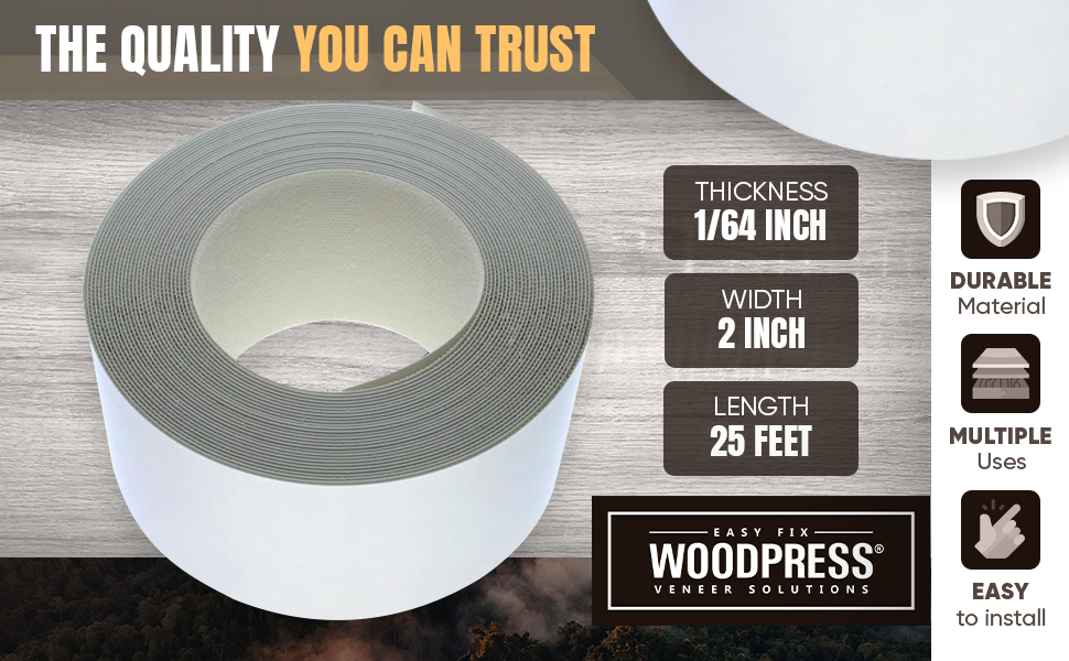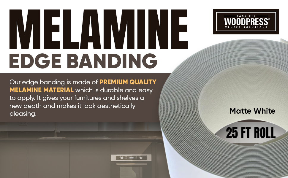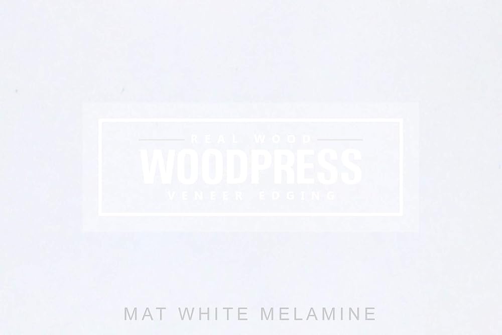 Woodpress® 1 & 3/16 بوصة Matt White Melamine Edge Banding ، شريط قشرة مسبقًا-لفة 25 قدمًا-Iron-On لتطبيق DIY سهل-سيغطي حافة لوحة MDF قياسية 8 '× 4'