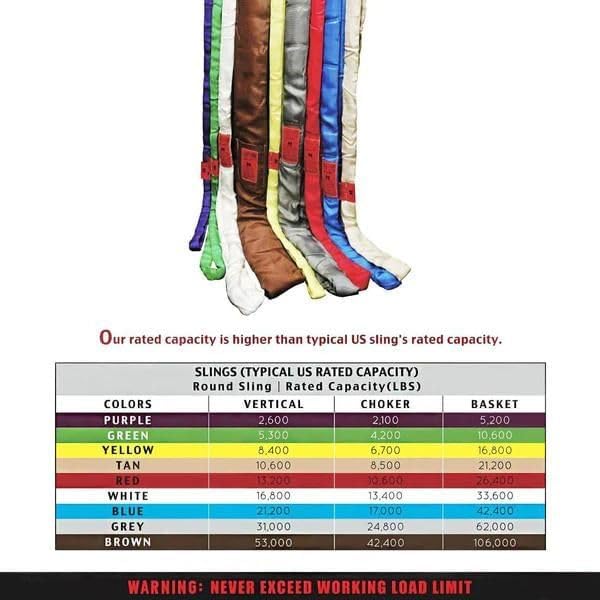 20 Feet Blue Round Sling, Rated Capacity: VERTICAL: 23,000 LBS (US typical capacity: 21,200 LBS) CHOKER: 18,400 LBS (US typical capacity: 17,000 LBS) BASKET: 46,000 LBS (US typical capacity: 42,400 LBS) Comes with WARNING sheet and safe practice instructions. Brand: ME